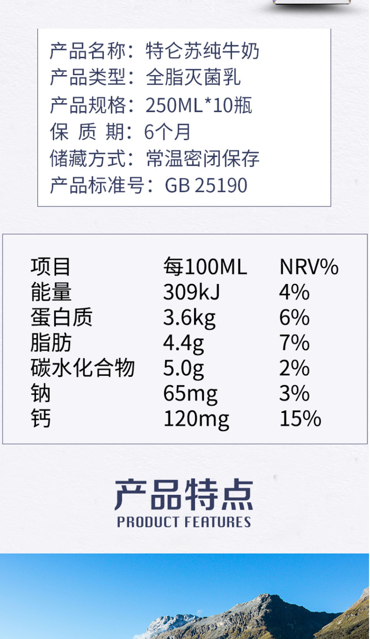 特仑苏纯牛奶全脂灭菌乳利乐梦幻盖250ml×10包