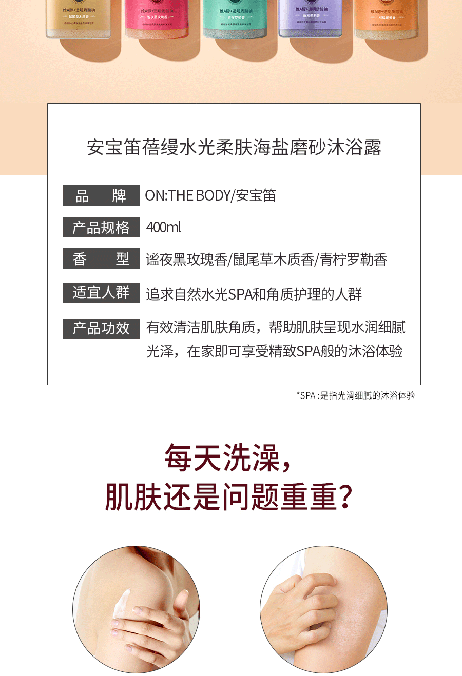 韩国进口LG on the body安宝笛海盐去角质沐浴露-优雅茉莉香(400ml/瓶)生产日期: 25年10月