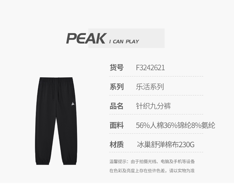 匹克2024年新款时尚生活系列男款针织九分裤F3242621