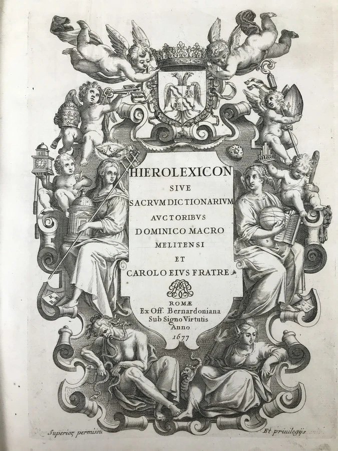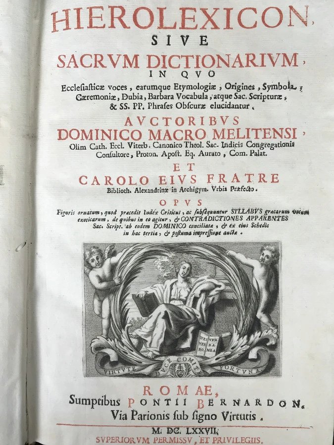 Domenico Magri(1604-1672),是一位出生于马耳他的神学家、作家、演说家、旅行家,在强大的意志和不断努力下完成神学学业后,又前往罗马学习哲学课程,一直立志于传播罗马天主教福音。早年红衣主教奥斯尼将其派往东方处理马龙派问题,但因他当时太过年轻也没有处理复杂事务的经验并未展露才华,没过多久便被罗马教廷召回从事阿拉伯语圣经的翻译和校对工作,这也成为其毕生事业。他的著作《Notitia de' vocaboli ecclesiastici》在罗马、威尼斯都有大量出版纪录,在德国也以拉丁语形式出版过,后来同时期也有英译本出现。后来他的弟弟Charles Magri将其重新命名为Hierolexicon sive sacrum dictionarium,并对拉丁语翻译进行了调整,于1677年在罗马再版,也就是现在我们看到的这个版本。这部作品对17世纪时期英国、德国以及欧洲大陆从事圣经翻译、研究的学者产生了深远的影响,尤其是他在旧约研究中展现出非凡的语言学、历史文化知识。