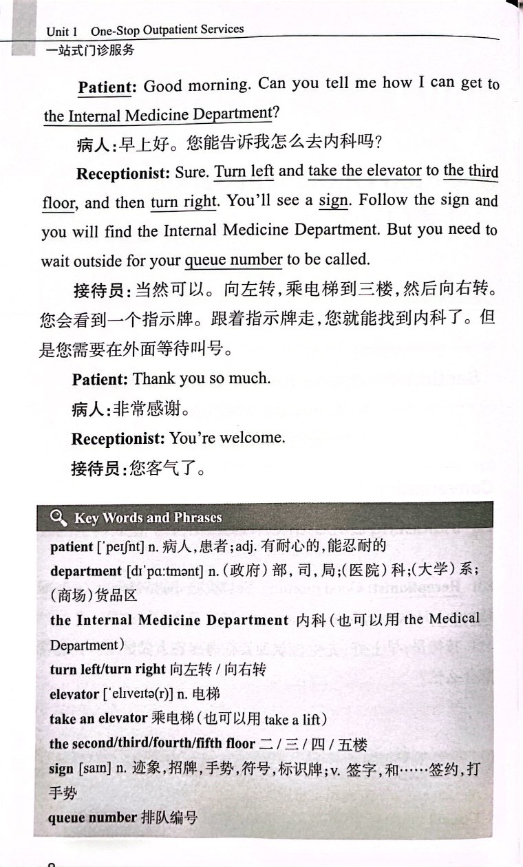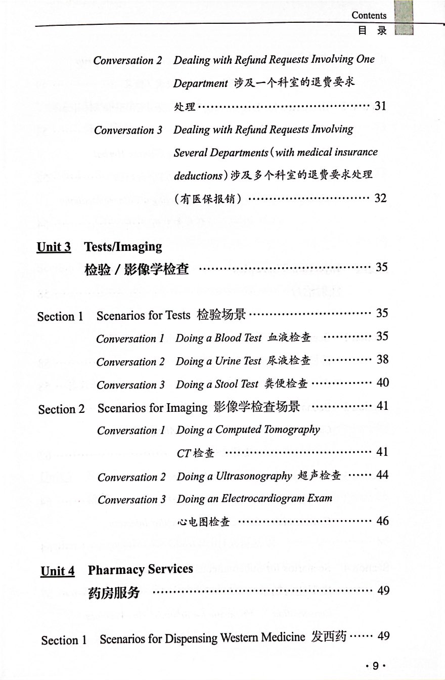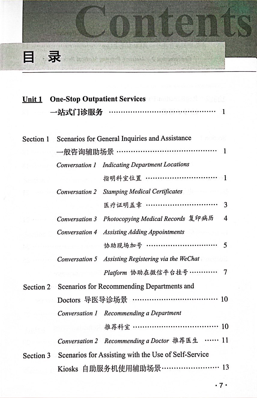 本书读者对象为医院不同服务窗口人员。主要以不同服务窗口人员在英语语言服务过程中可能遇到的各种情景为背景,模拟服务窗口人员与被服务人员(包括患者、家属等)之间的对话。同时提供实用的英语单词、短语和常用英语口语的基本句式及其使用场景,以帮助医院公共服务窗口人员更好地提高其英语语言服务能力,与患者和其他人员进行更有效的交流和沟通。内容涵盖不同服务窗口包括检查预约中心、挂号与收费处、药房、住院服务中心、门诊服务中心、急诊服务中心、体检中心、检验化验中心必备的英语语言技能、服务的流程与语言应用等。此外,手册还提供了不同的使用场景、问答和练习,以帮助学习者巩固所学内容,提高英语语言服务能力,更加有效地与患者和其他人员进行交流和沟通。