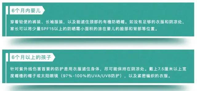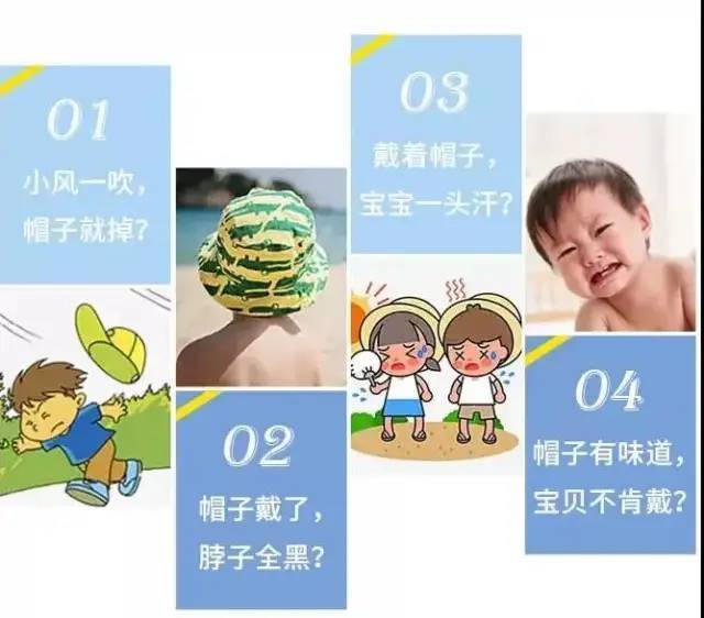 美国儿科学会的建议中,特别提到了能够遮住颈部有檐的防晒帽, 而且对于6个月以上的孩子帽椽宽度需要7.5cm以上