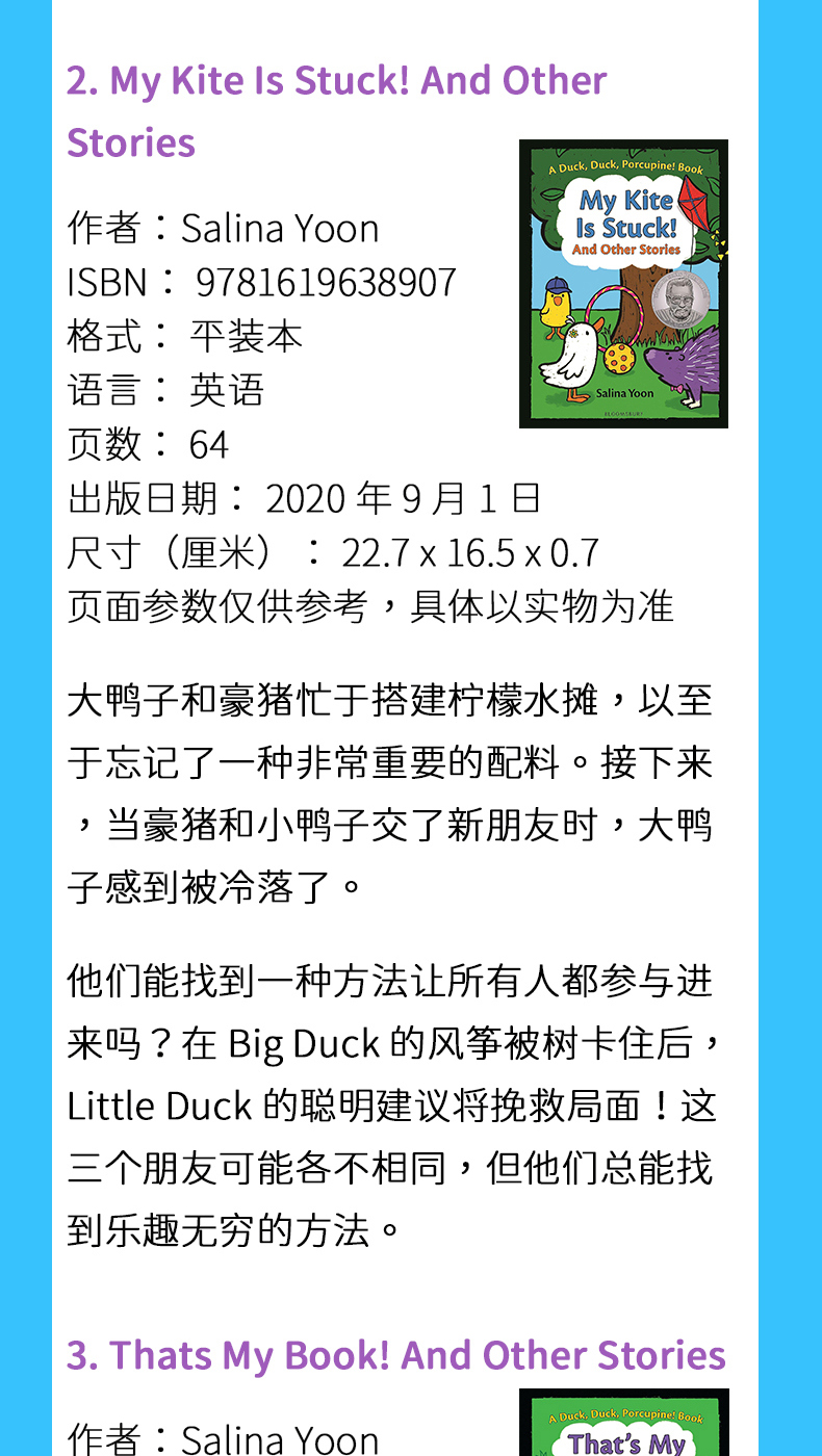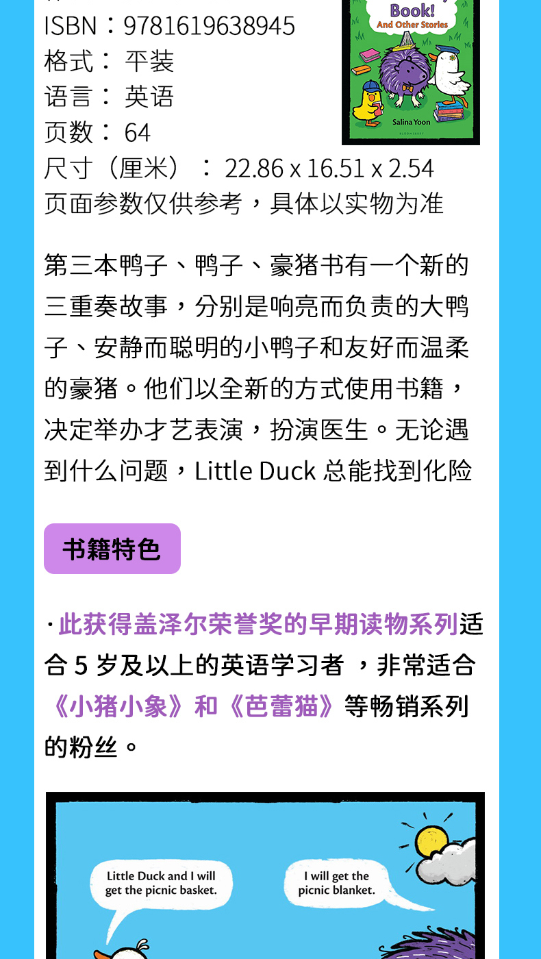 注:本链接于2024年7月11日更新版本,其中《Salina Yoon:Thats My Book! And Other Stories农场三小只:那是我的书》由原来的精装版本改为平装版本。详细书籍目录见下。主图仅供参考,具体请以实物为准。