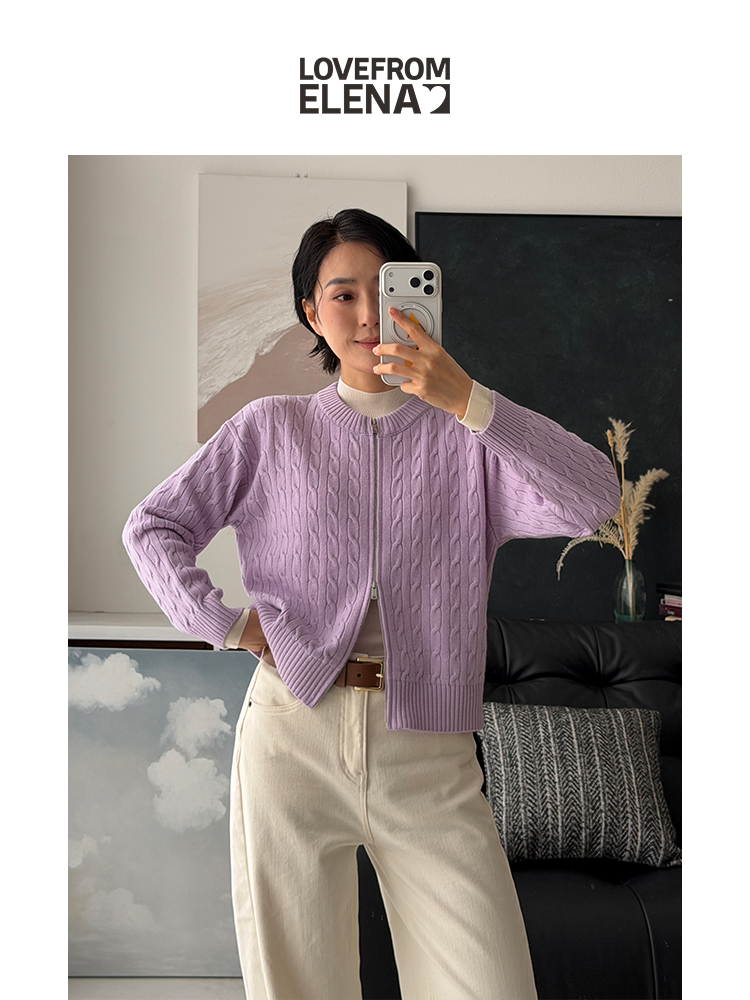「工厂团购」羊绒羊毛混纺 圆领绞花拉链针织开衫