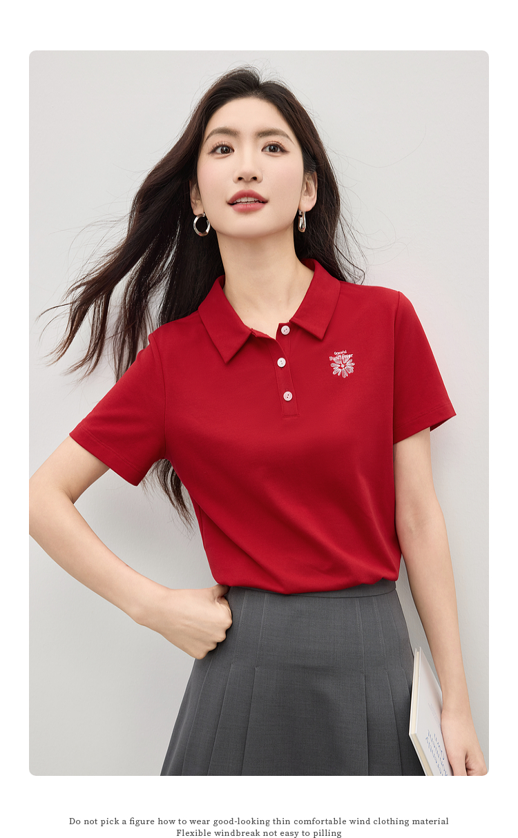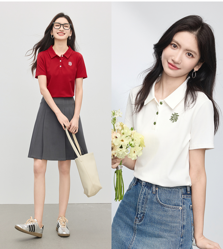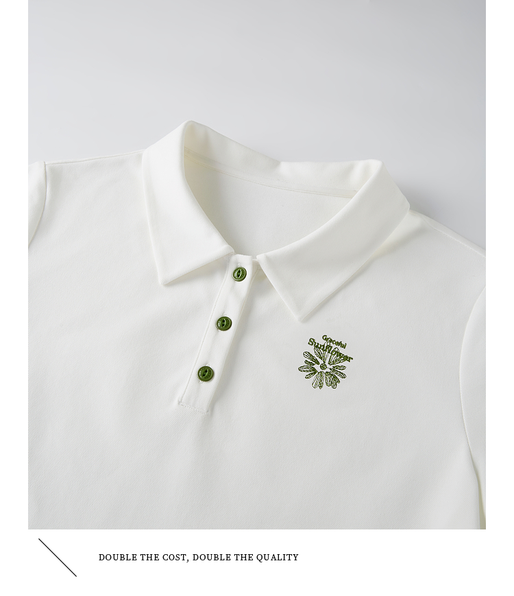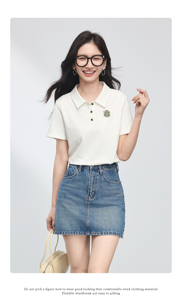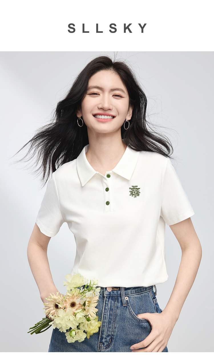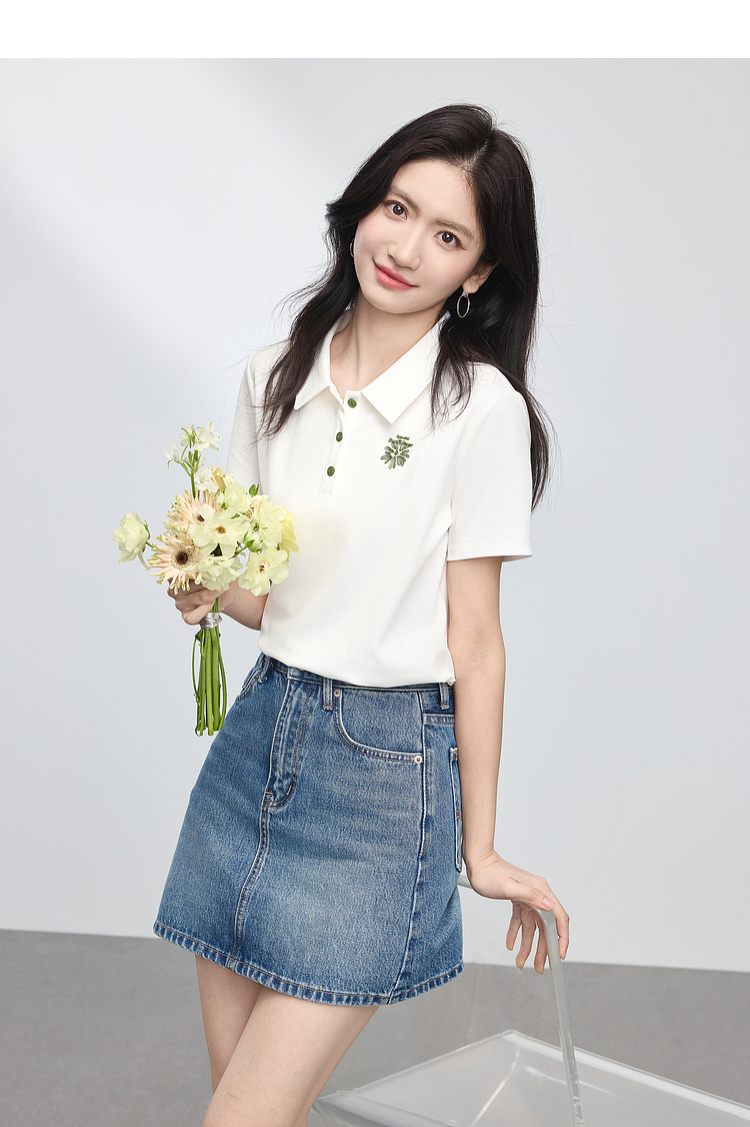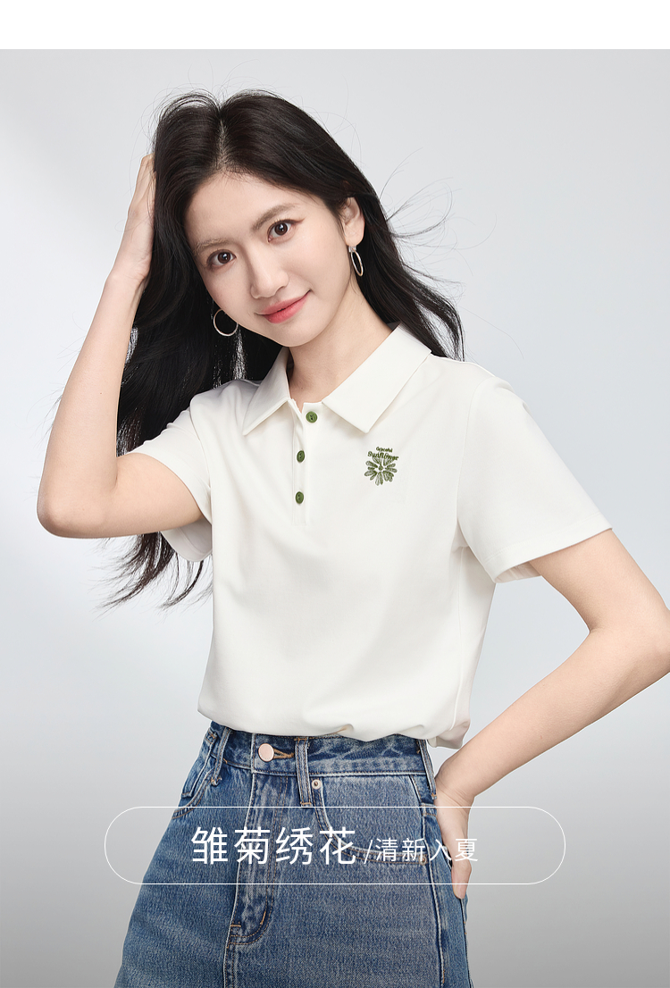 【专属特价】熙世界通勤白色polo领T恤短袖女2025夏季新款小雏菊绣花正肩上衣