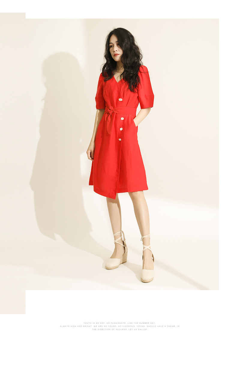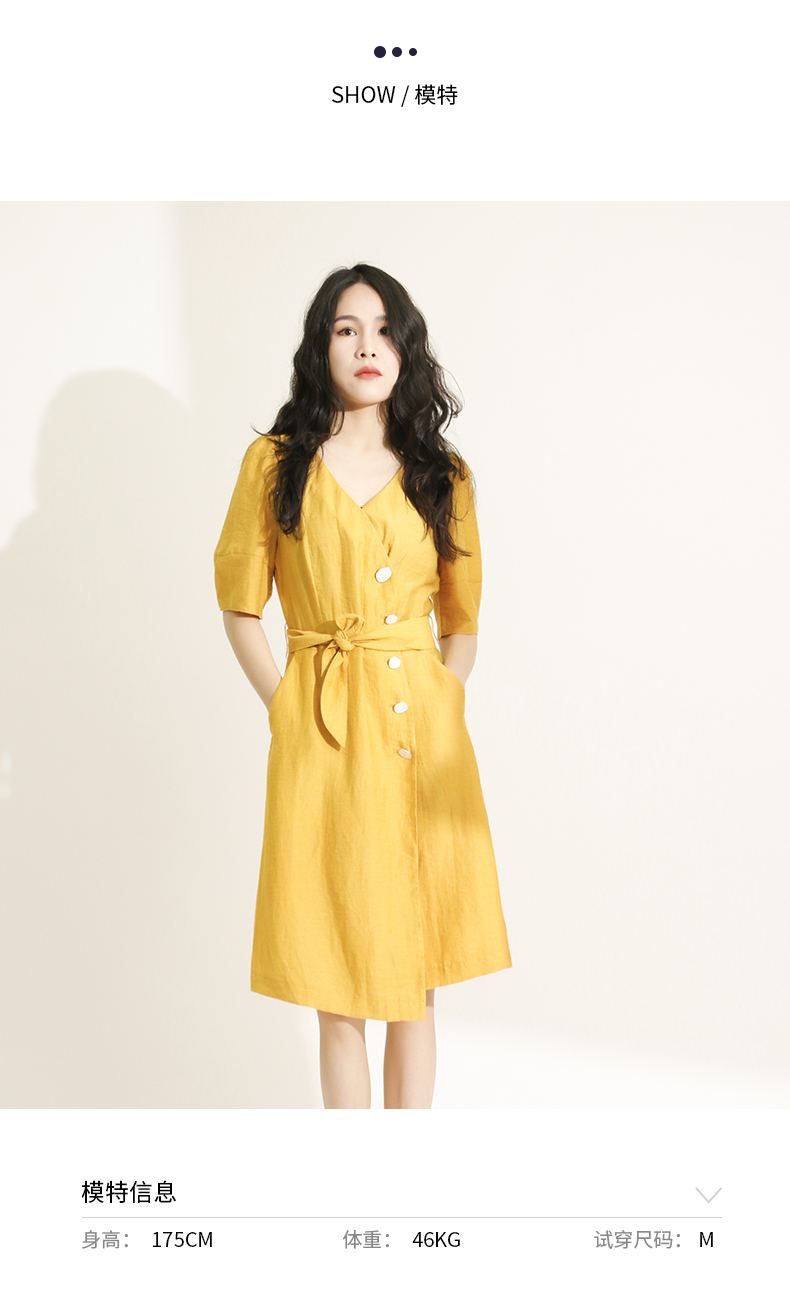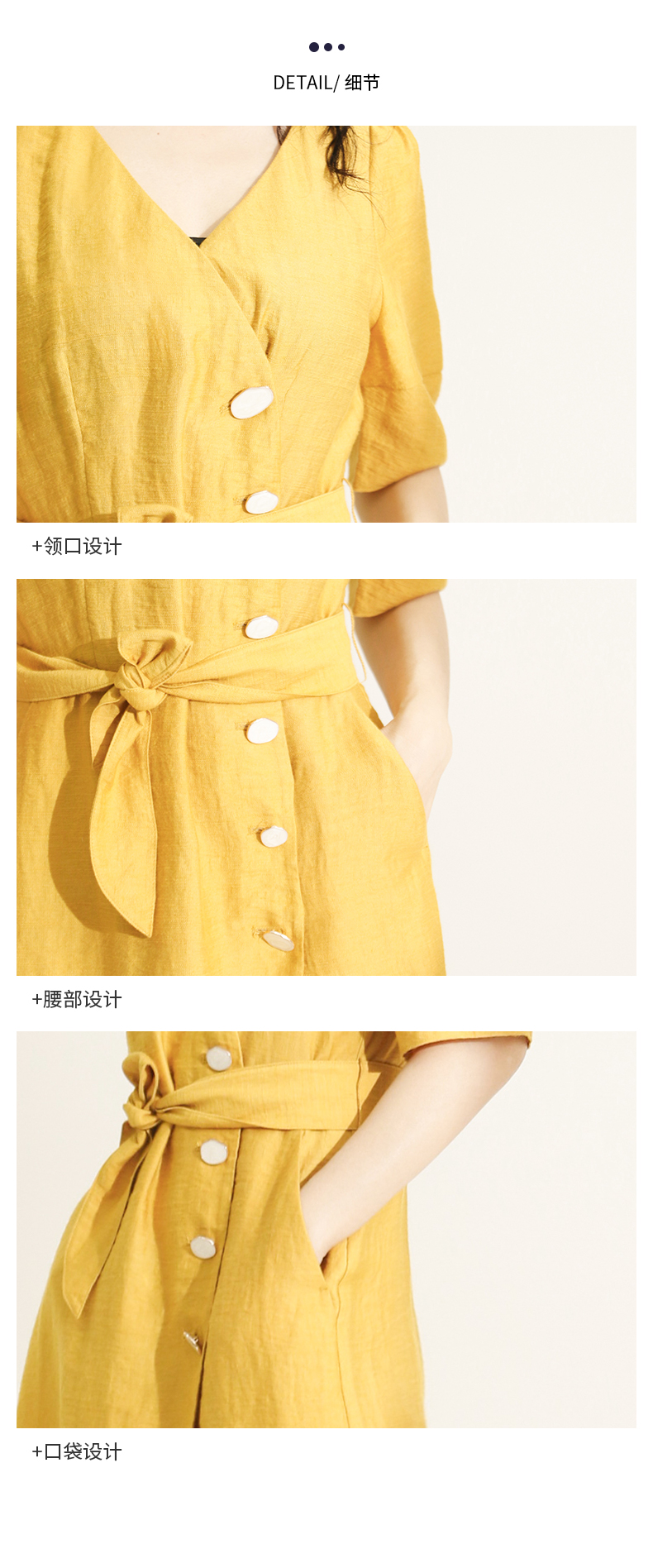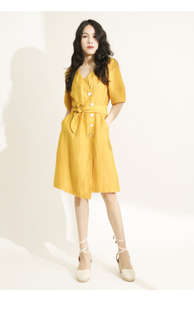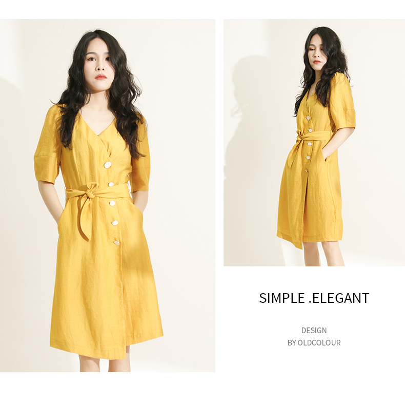 oldcolour欧珂亚麻V领收腰短袖连衣裙女中长款M21101407