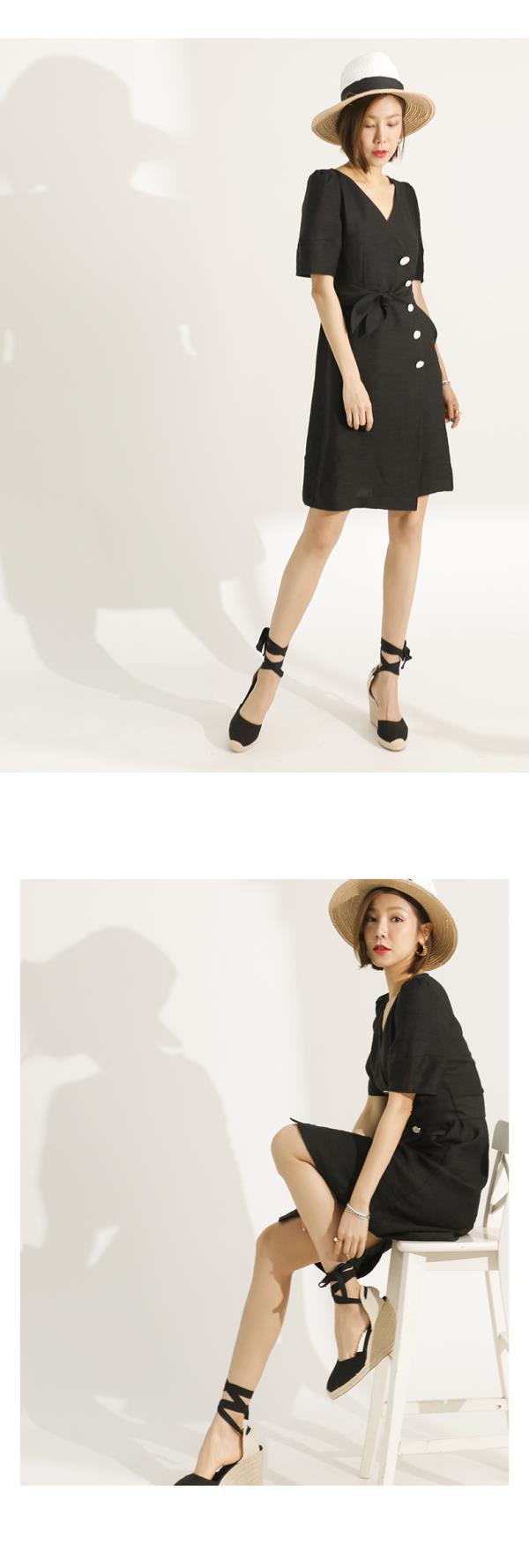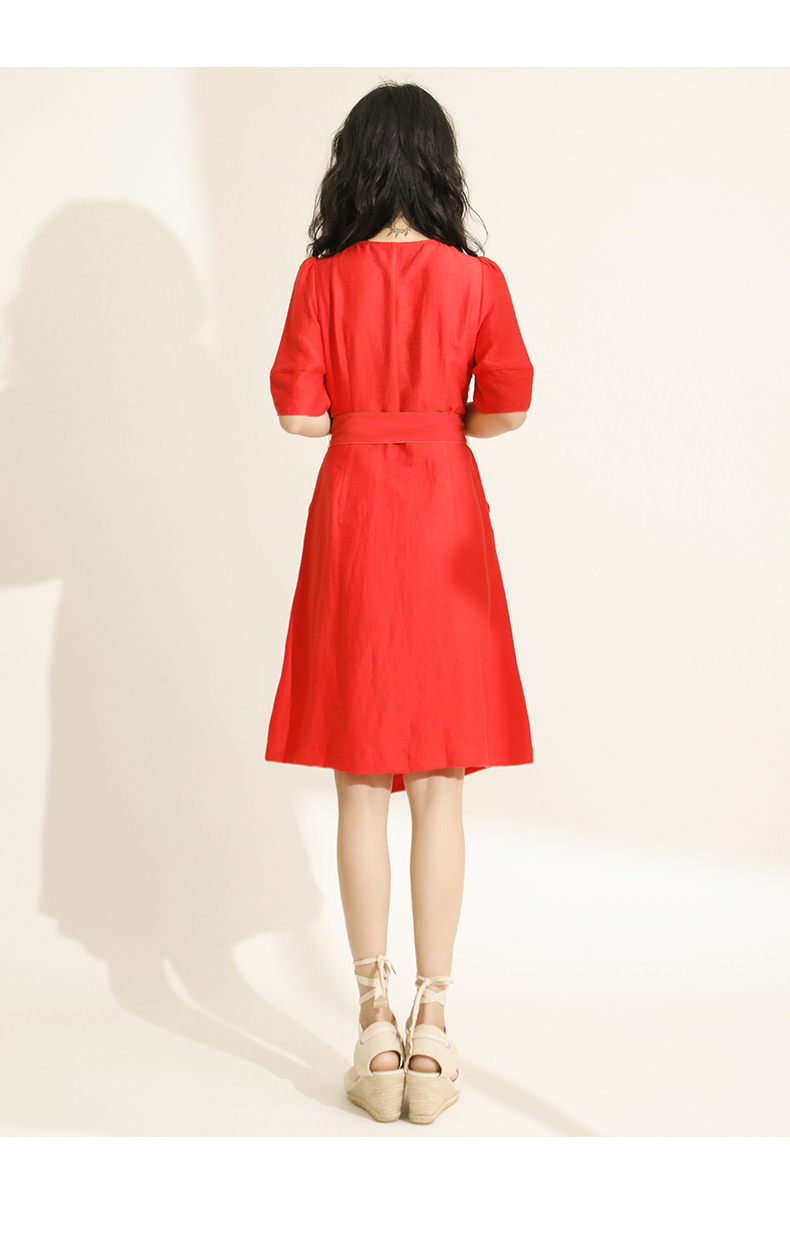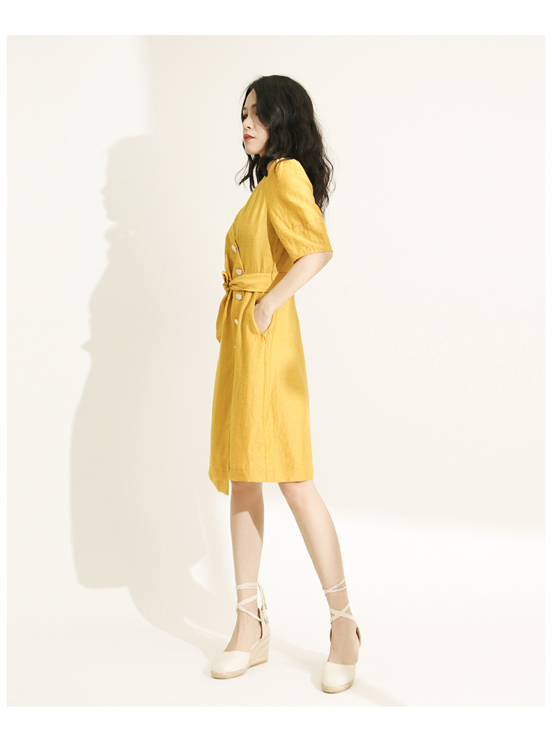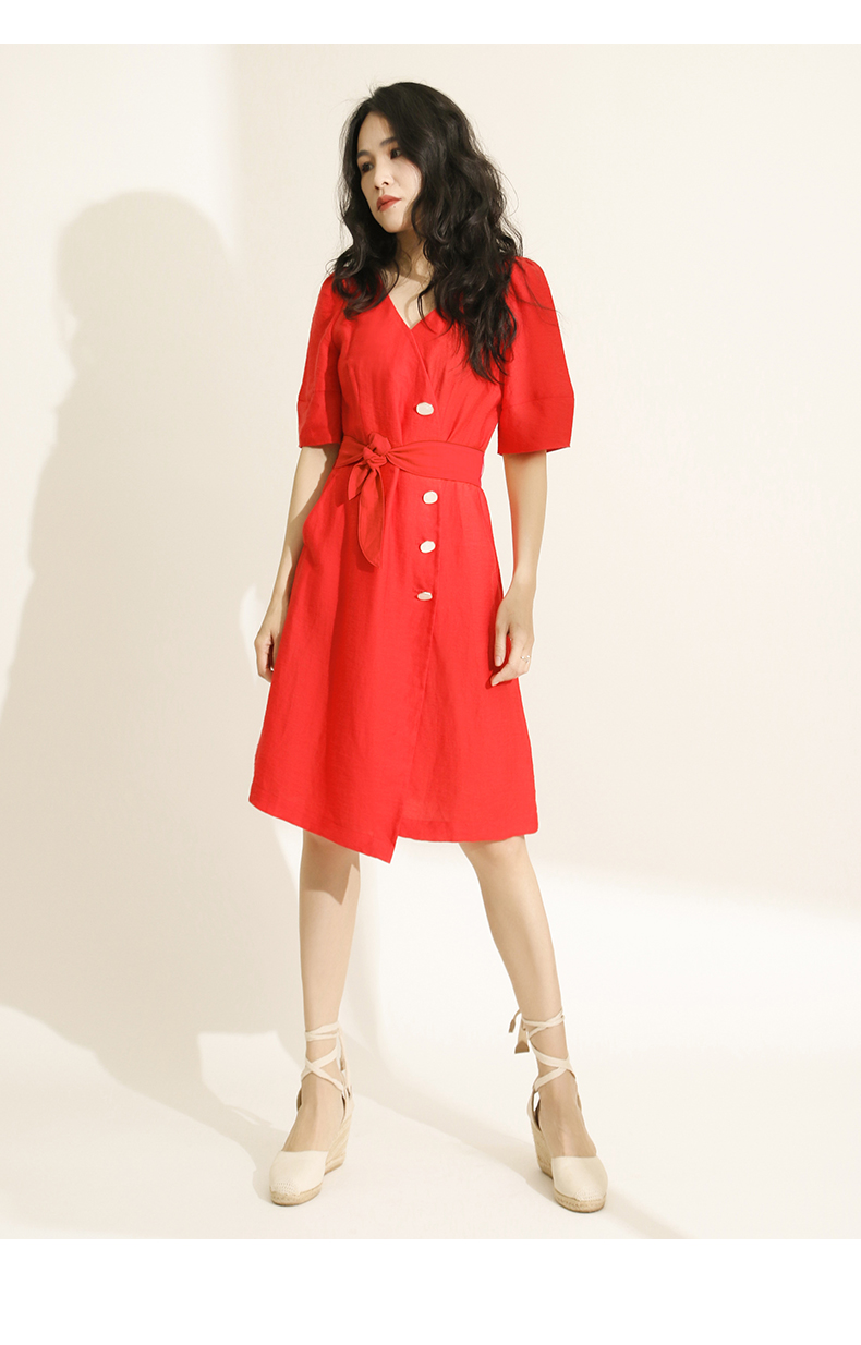 oldcolour欧珂亚麻V领收腰短袖连衣裙女中长款M21101407