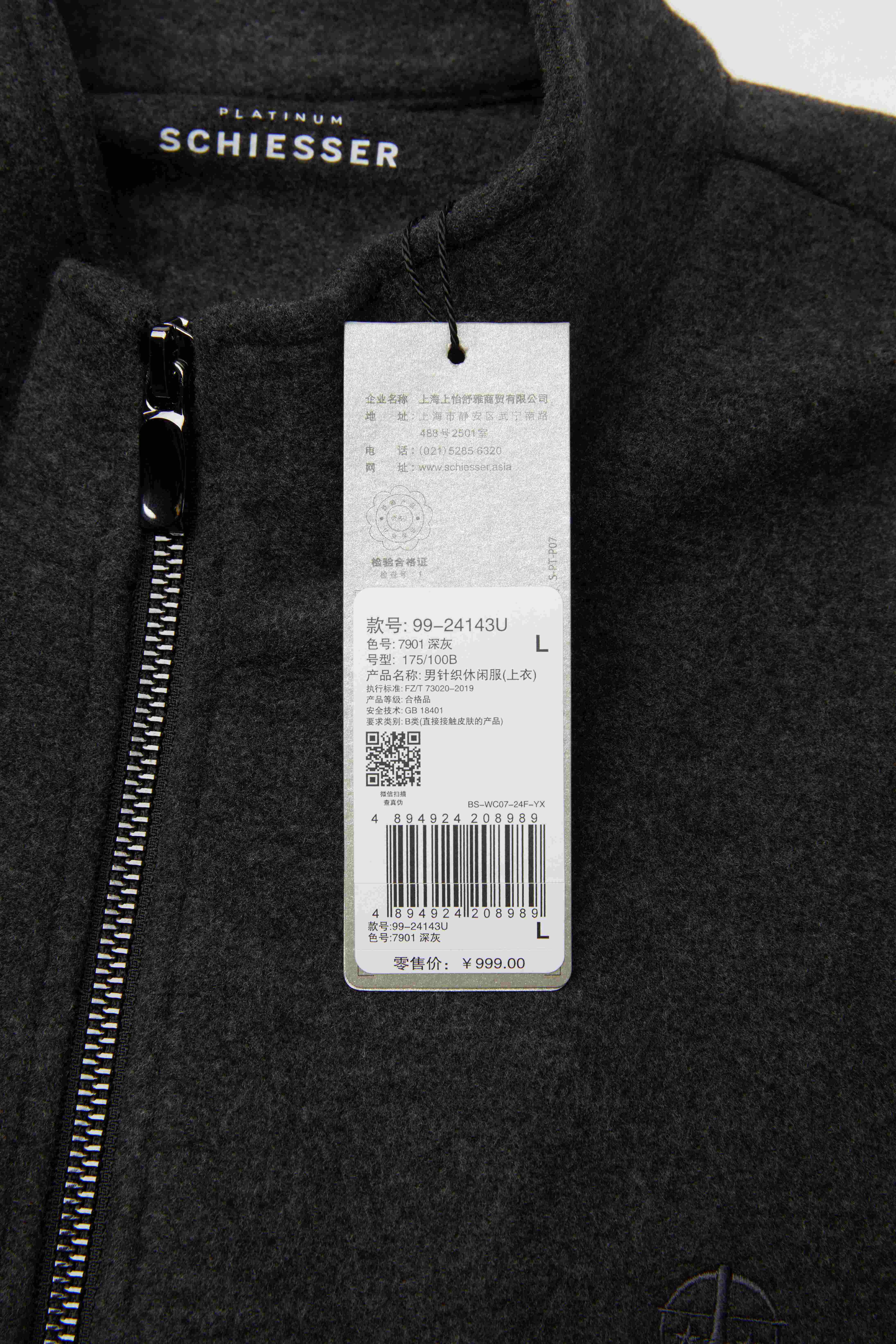 【铂雅复合面料 时尚外穿】SCHIESSER德国舒雅高端铂雅460g重时尚外穿立领拉链长袖长裤单件99/24143U 可在详情页最下面选择配套裤子