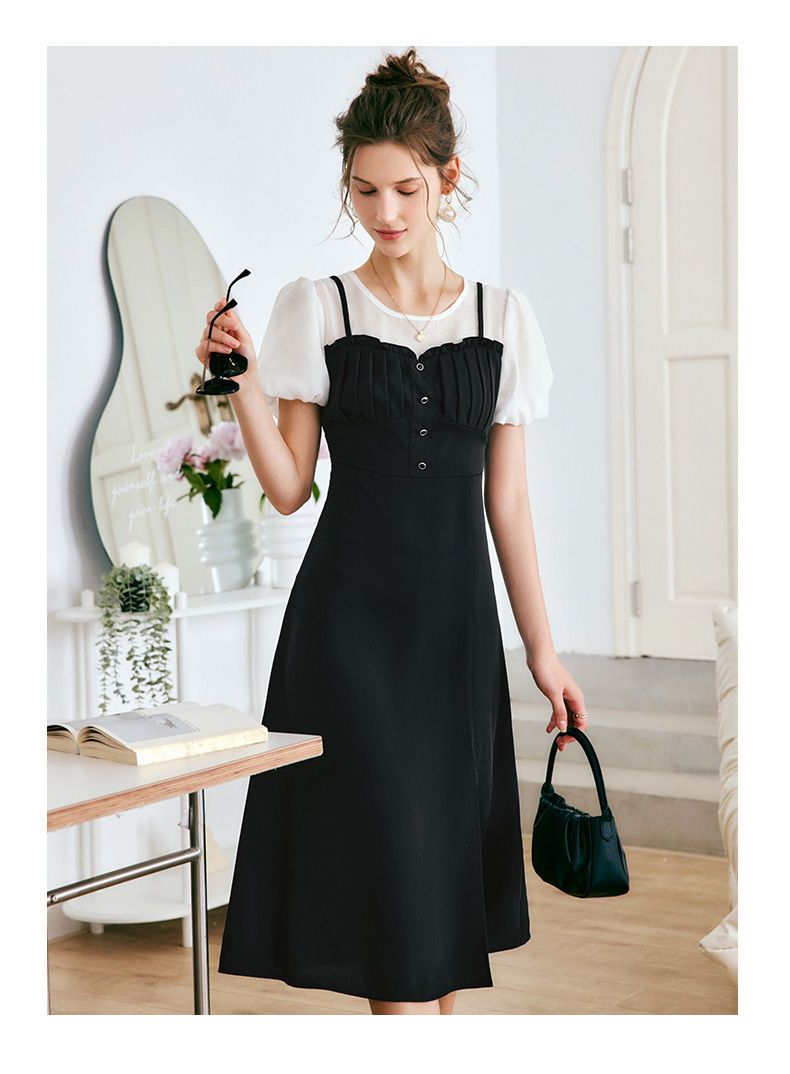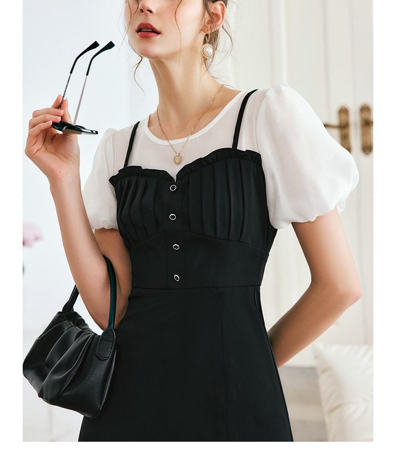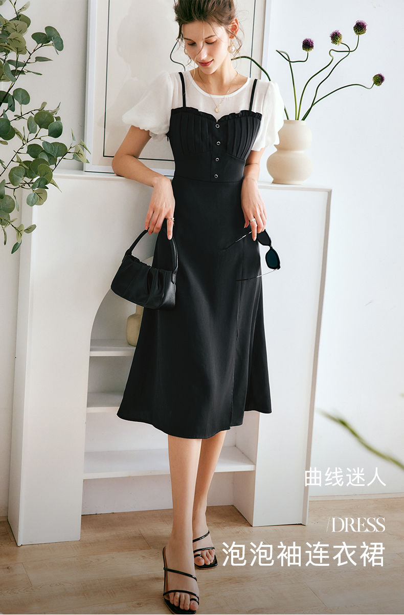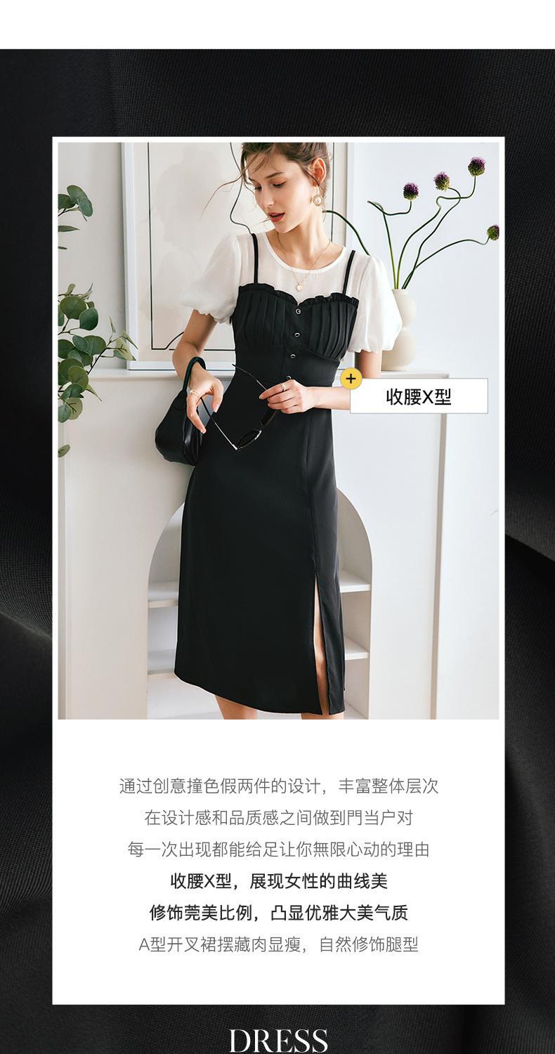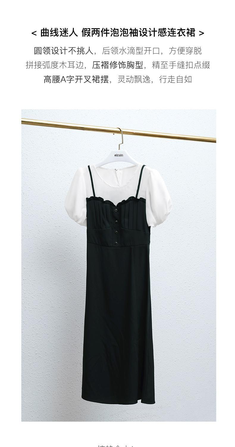 OLrain法式高级穿搭黑色短袖连衣裙女夏季2022新款吊带假两件裙子