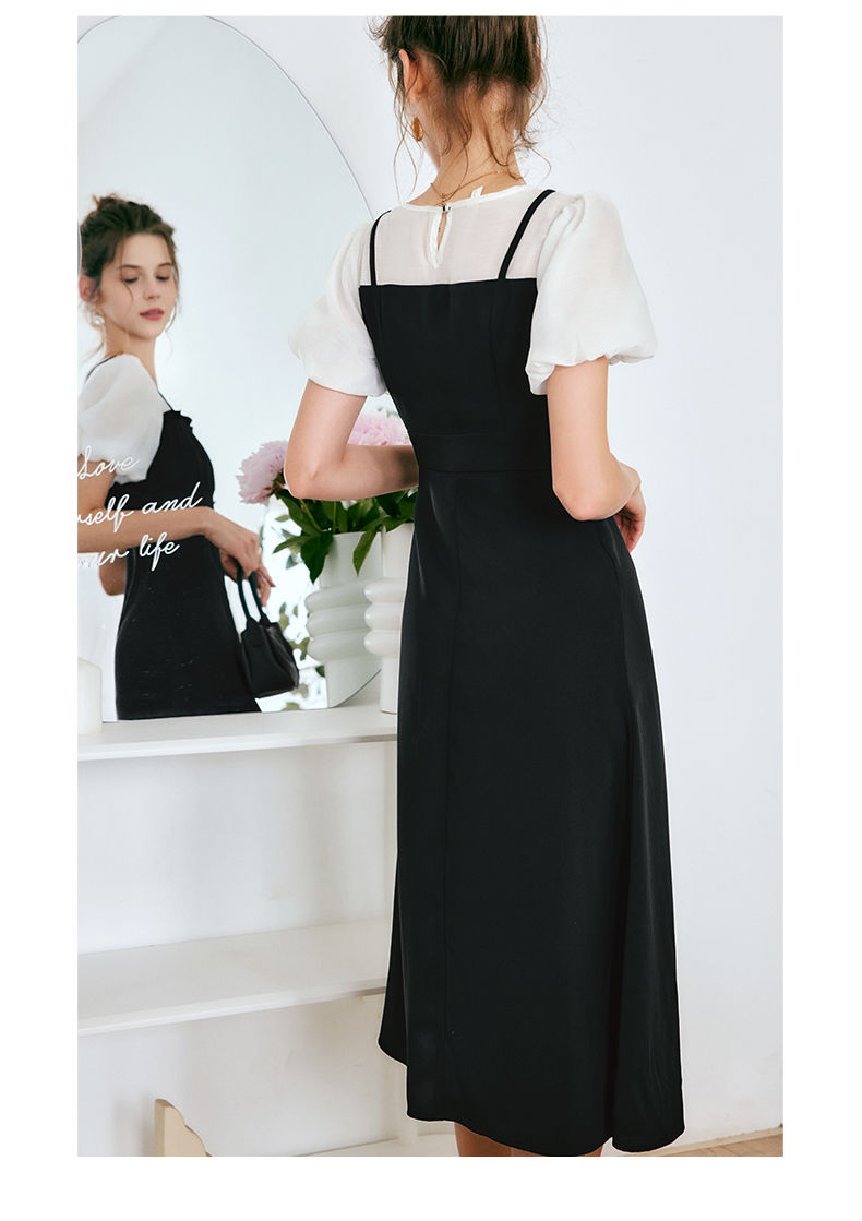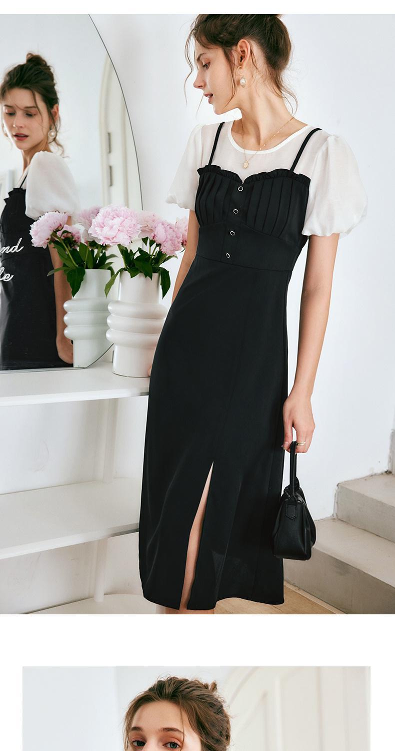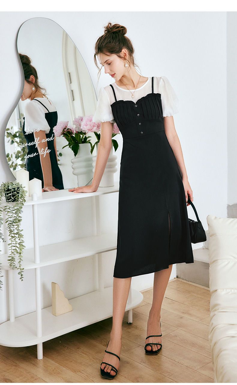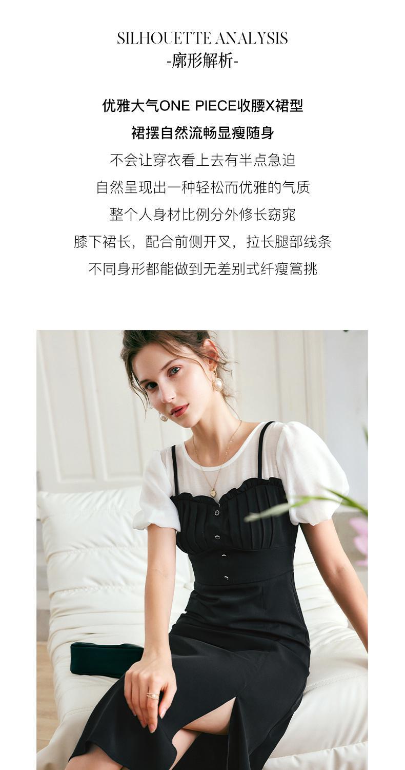 OLrain法式高级穿搭黑色短袖连衣裙女夏季2022新款吊带假两件裙子