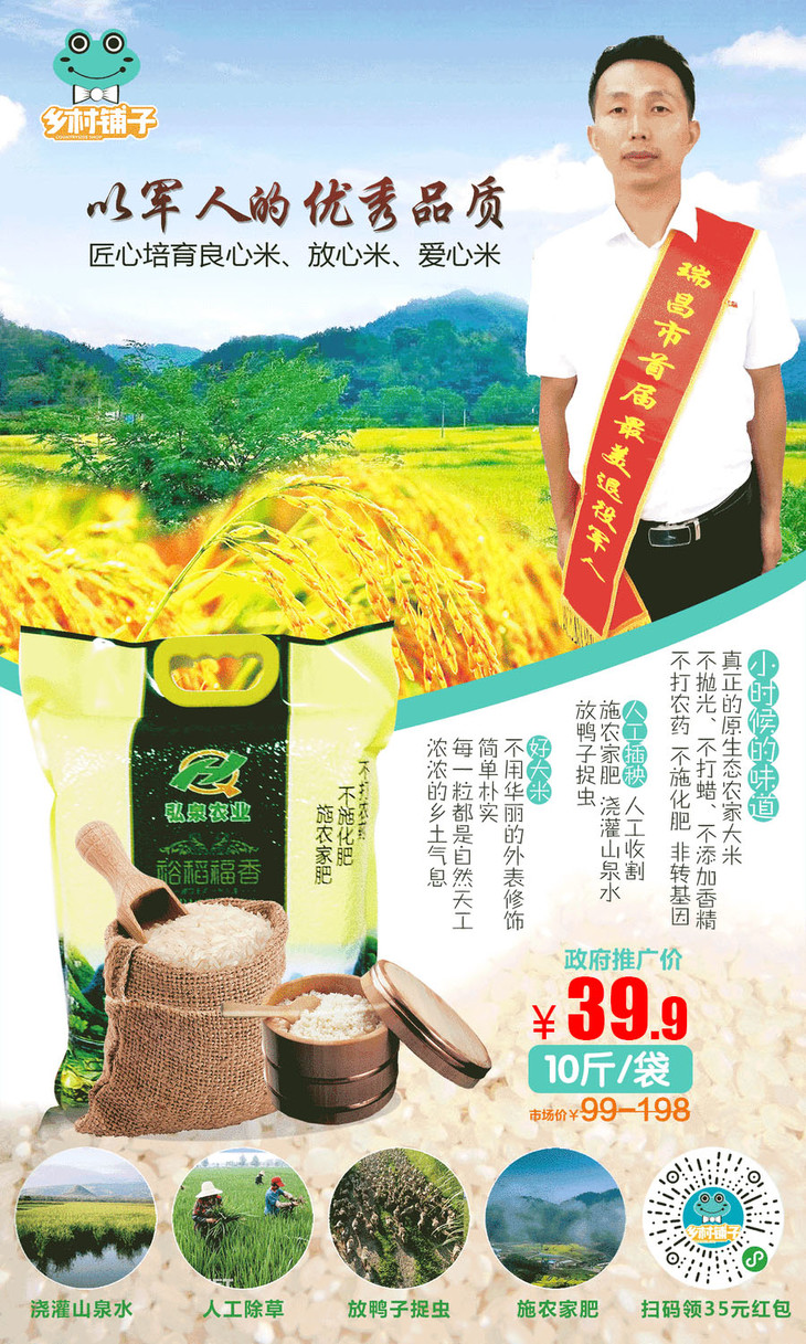 目前他们的产量太低、销售渠道也没打开,所以联系乡村铺子面向全国推广。 现在市面上普通的大米大概3-10块钱一斤,我们核算了成本,比市面上的米肯定贵,但是,新米好米贵一点我想对于追求绿色健康的人都不会在意,何况现在的人一个月也吃不了多少米,“每天多花一块钱,让您的孩子和家人吃上放心的米饭”这样不值吗?