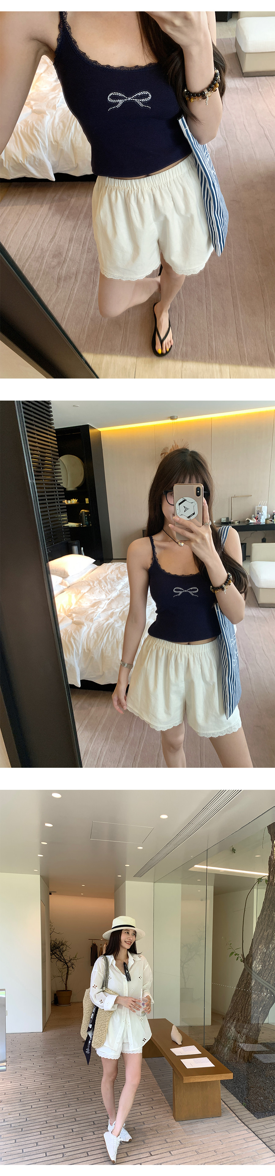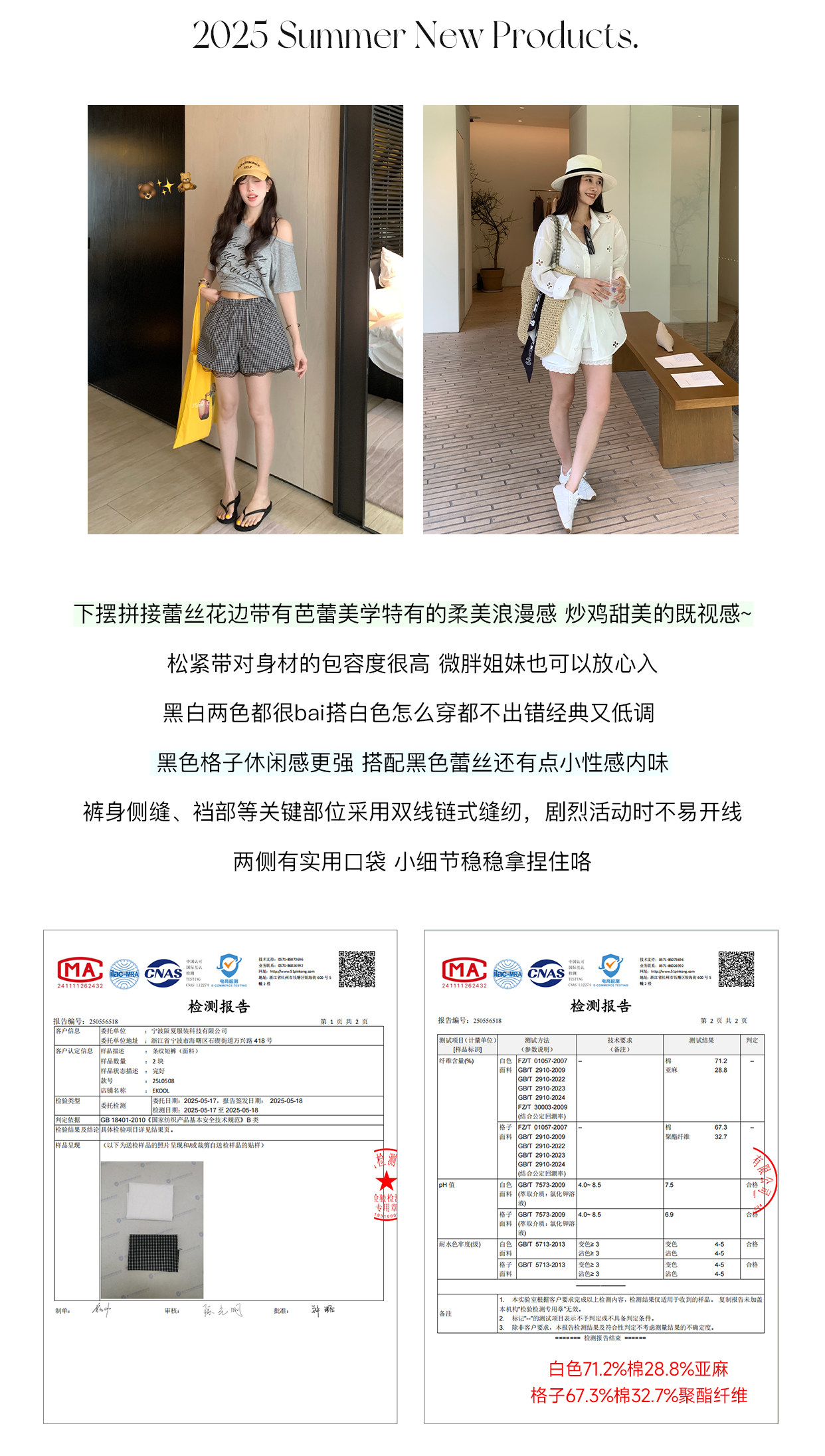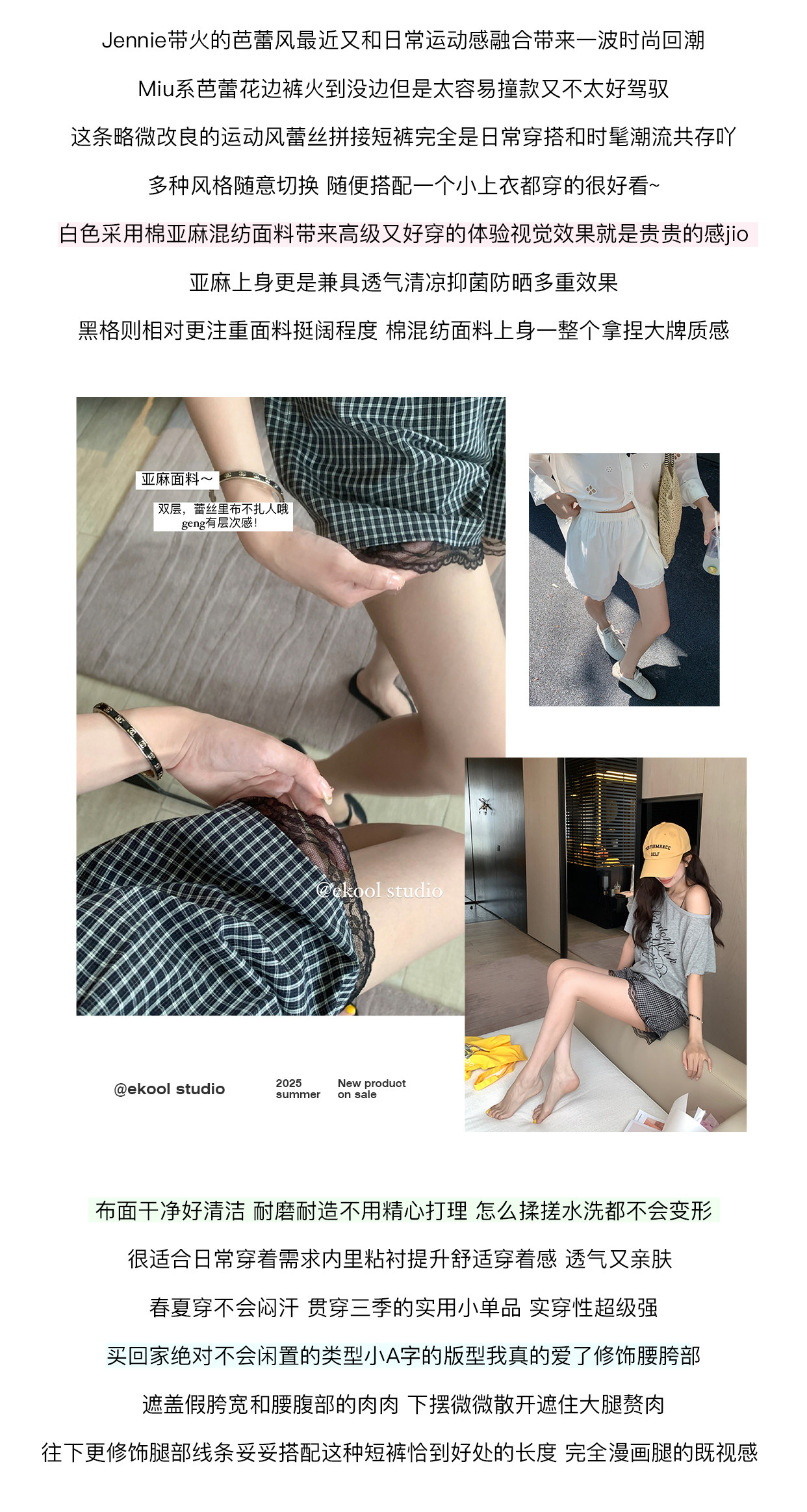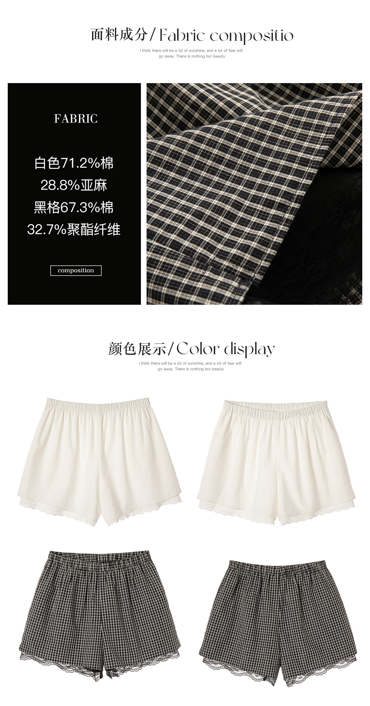 EKOOL衣库 蕾丝花边棉麻高腰短裤女夏季松紧腰宽松百搭显瘦休闲裤