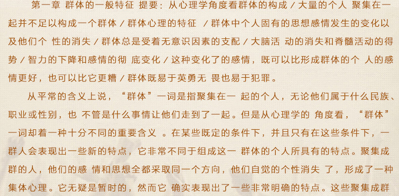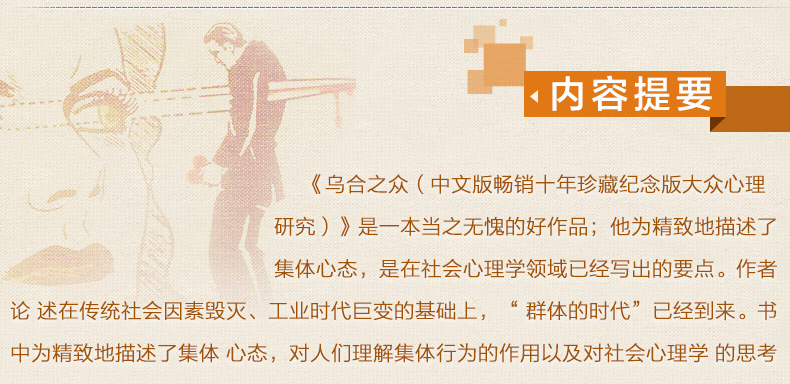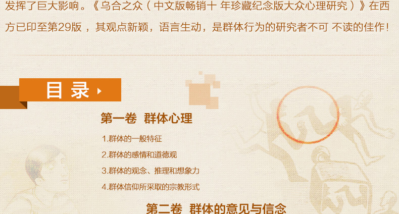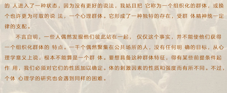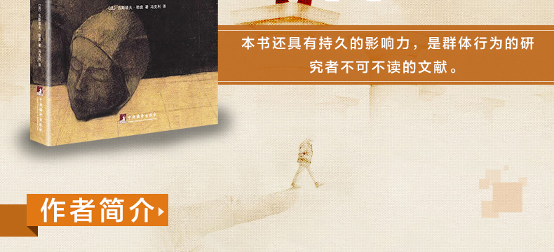 《乌合之众:大众心理研究》作者是法国zhuming社会心理学家古斯塔夫.勒庞自1894年始,写下一系列社会心理学著作,以本书为zhuming;在社会心理学领域已有的著作中,有影响的,也是这本并不很厚的《乌合之众:大众心理研究》。作者论述在传统社会因素毁灭、工业时代巨变的基础上,“群体的时代”已经到来。书中极为精致地描述了集体心态,对人们理解集体行为的作用以及对社会心理学的思考发挥了巨大影响。《乌合之众——大众心理研究》在西方已印第29版,其观点新颖,语言生动,是群体行为的研究者的佳作.
