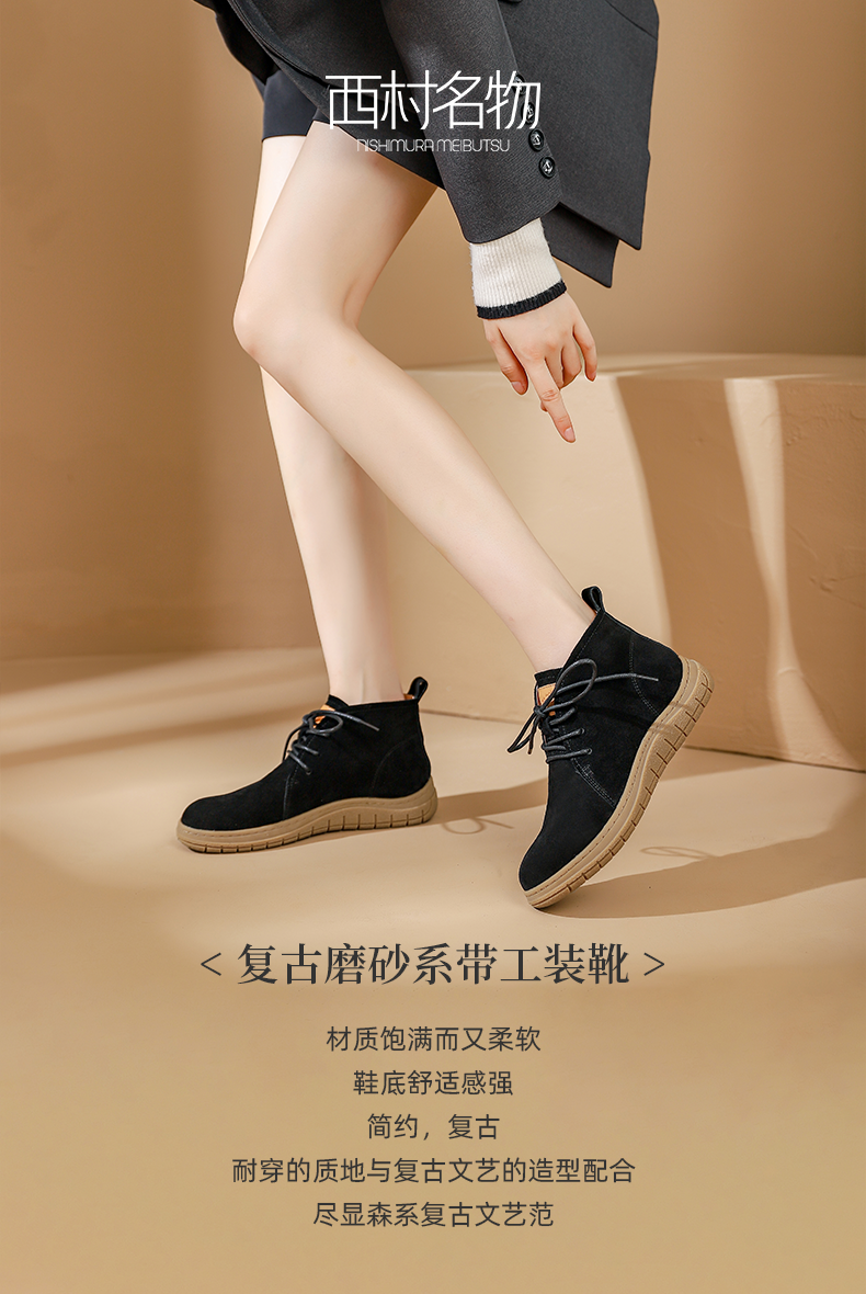 西村名物2023秋季新款休闲复古圆头系带平跟马丁靴T23DS44191