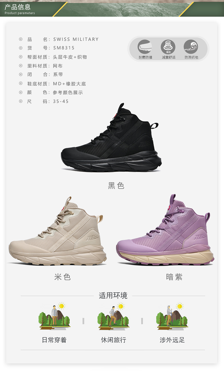 【159秒杀!中高帮!带防伪注册卡】瑞士军工SWISS MILITARY时尚情侣户外徒步登山运动鞋靴 SM8315