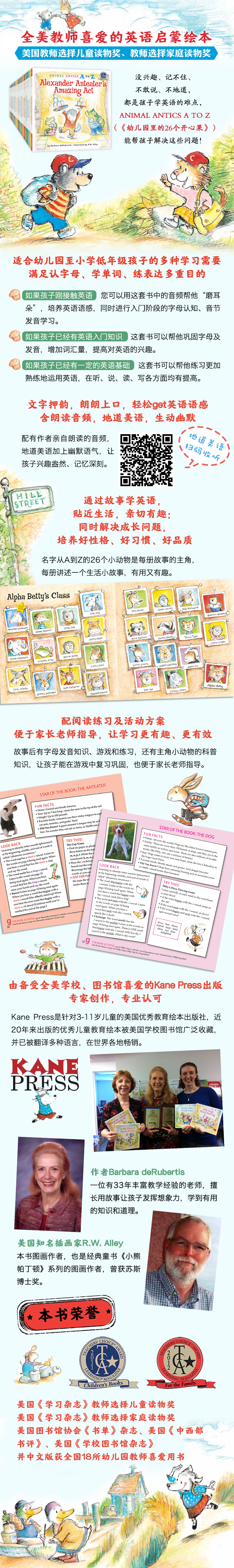 ANIMAL ANTICS A TO Z 系列(《幼儿园里的26个开心果》)共26册,名字从A到Z的26个小动物是每册故事的主角;文字中融入了大量包含同一字母的单词,既扩充了词汇量,读起来又朗朗上口;每个故事围绕一个主题,解决小朋友生活中遇到的各种问题:分享、交友、独立、合作、养成好习惯……有用又有趣;每册后面还有主角小动物的科普知识。适合幼儿园至小学低年级孩子阅读。