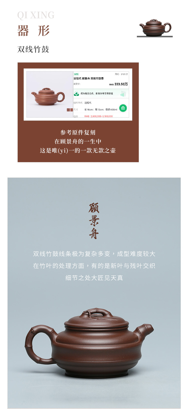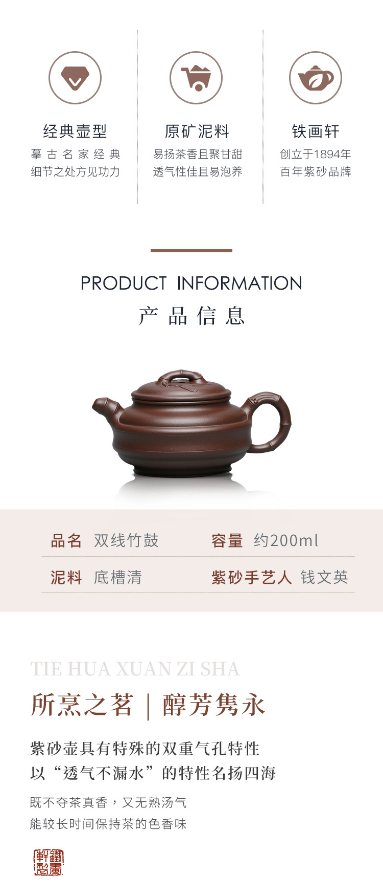 百年紫砂品牌铁画轩出品 双线竹鼓紫砂壶