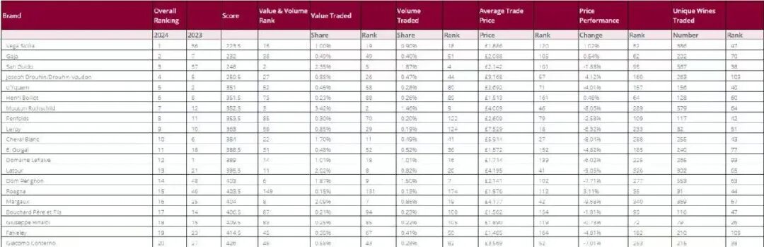 伦敦葡萄酒交易所Live-ex发布的世界葡萄酒品牌排行榜一直是全球葡萄酒爱好者们购买葡萄酒醉佳的参考指标,而在2024年最新发布的全球100大葡萄酒排行榜中,来自西班牙酒王Vega Sicilia荣登全球第一宝座,力压法国酒王Leroy和康帝,意大利酒王Giacomo Contero、Gaja和San Guido(西施佳雅)。