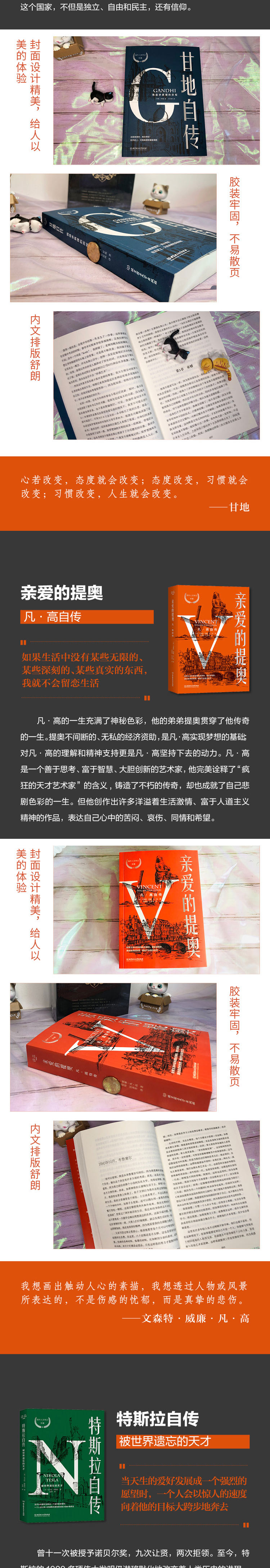 【图书名称】 国外人文传记•珍藏版(全4册)(《甘地自传:我追求真理的历程》《亲爱的提奥:凡·高自传》《特斯拉自传:被世界遗忘的天才》《拿破仑传》)
