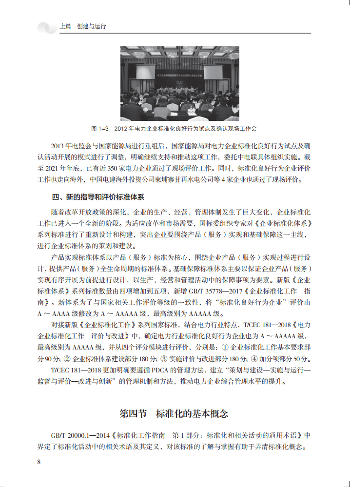上篇:创建与运行,包括第 1~ 12章。主要内容是以“标准化良好行为企业”的创建为主线,指导发电企业开展标准化体系构建和标准编制、促进运行和持续改进工作,在企业内建立“最佳秩序”,实现经营方针和目标。其他企业可以借鉴原理方法和给出的示例。