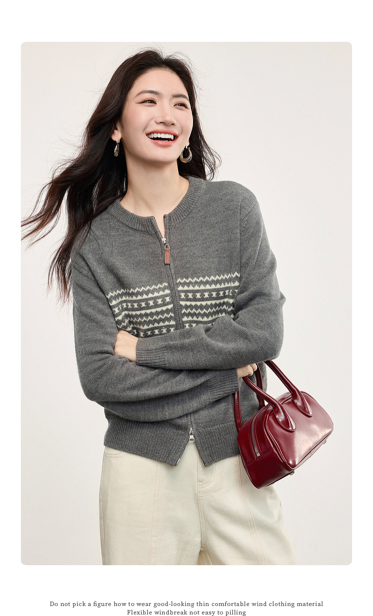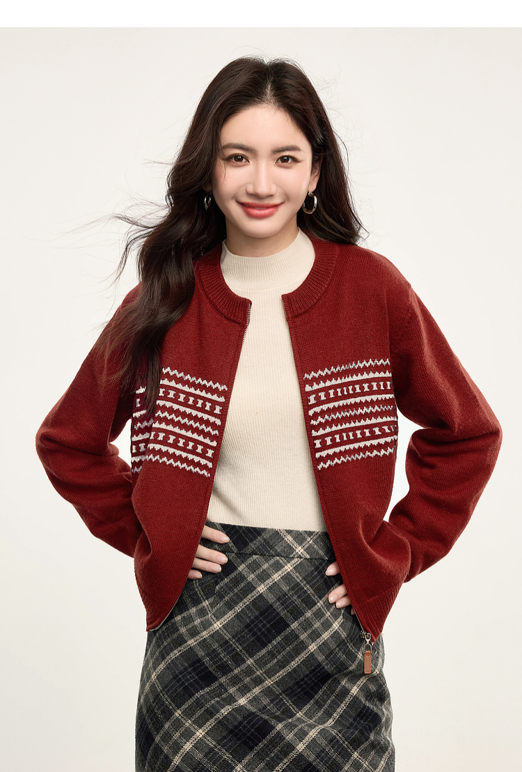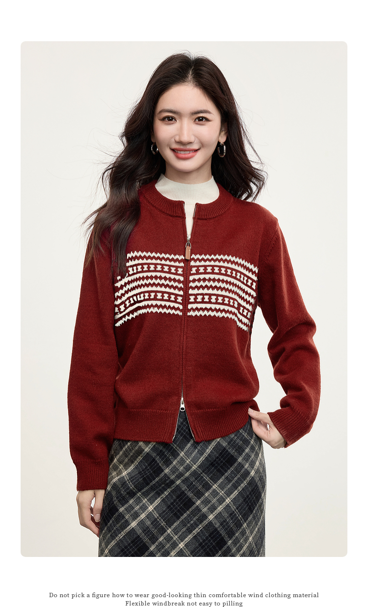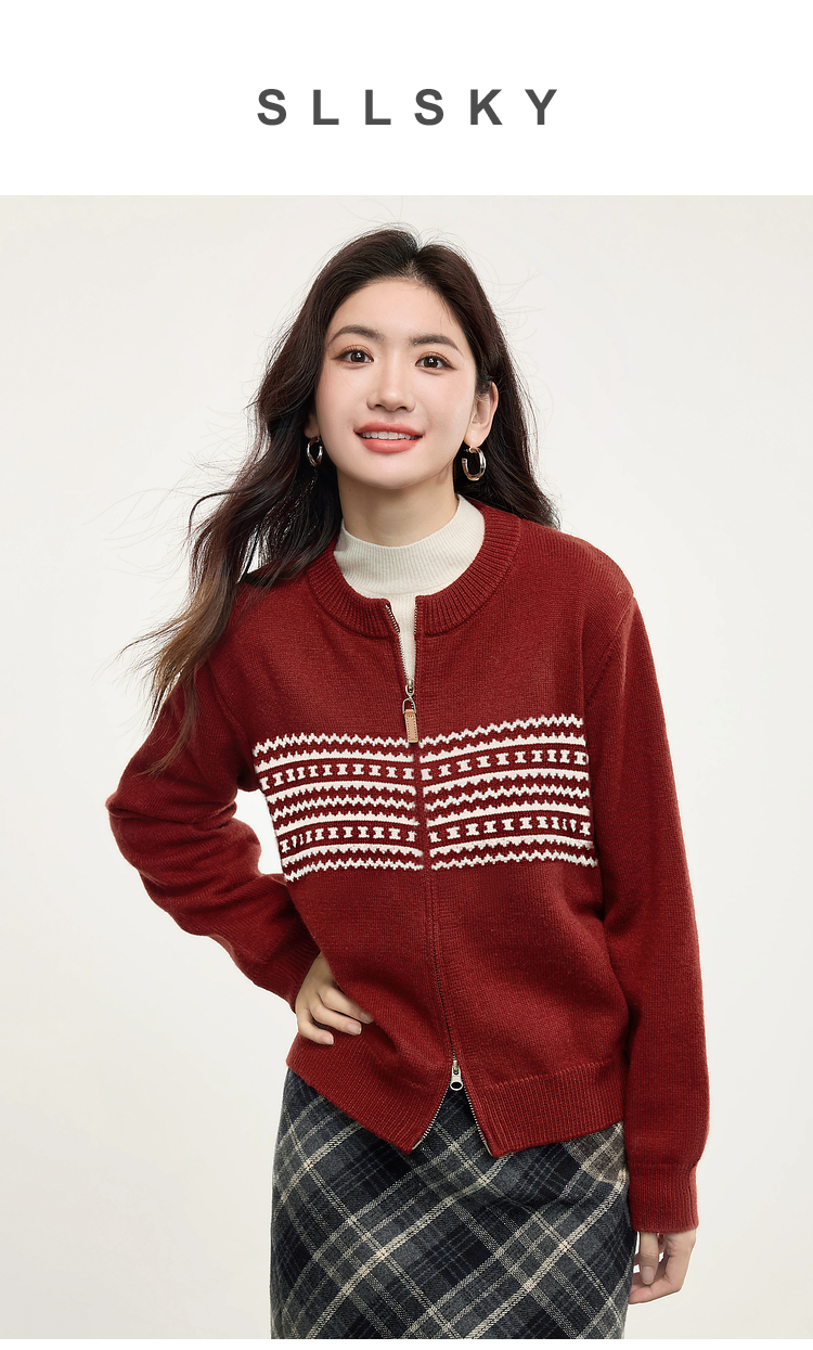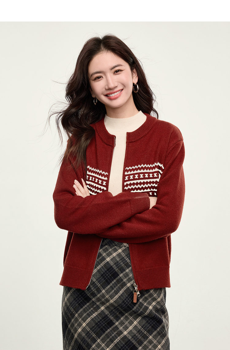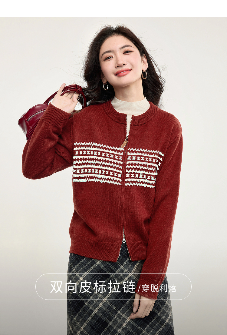 【1件65折】熙世界新年红色费尔岛毛衣开衫风秋冬设计感双拉链针织短外套
