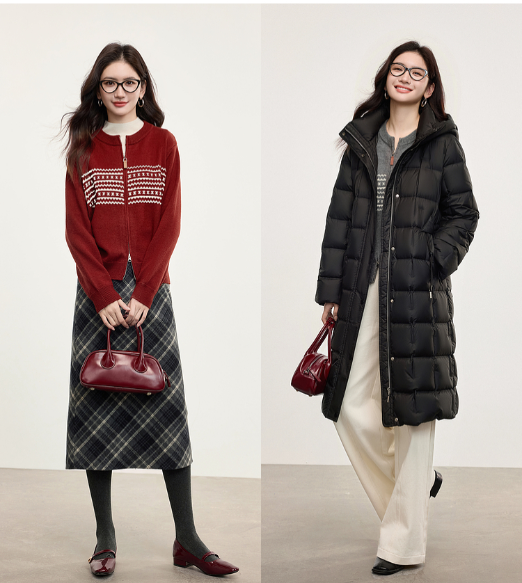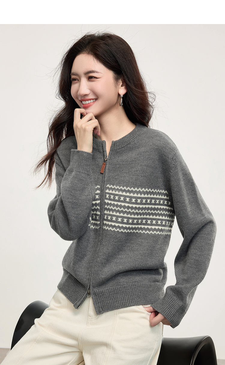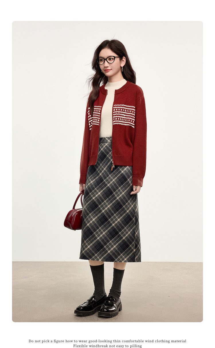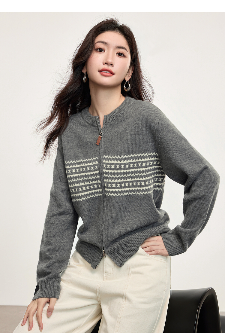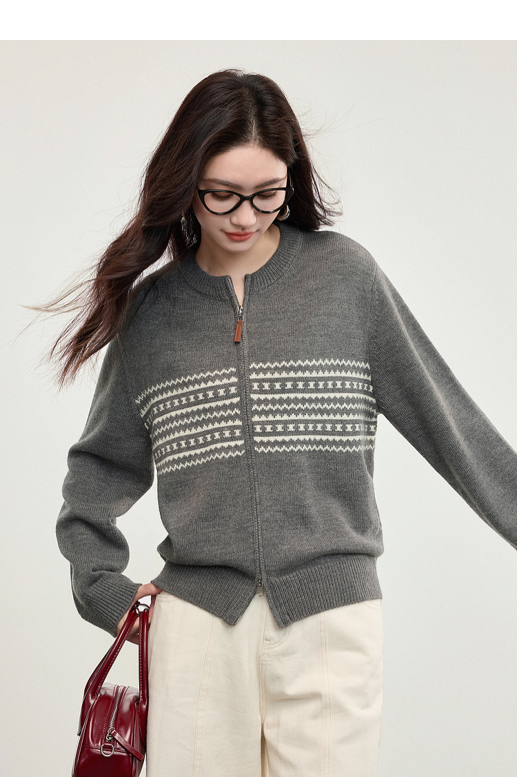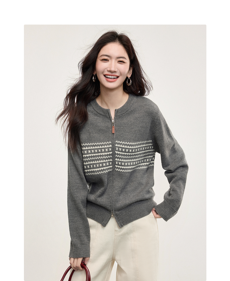 【1件65折】熙世界新年红色费尔岛毛衣开衫风秋冬设计感双拉链针织短外套