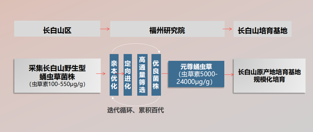 以原产地长白山区野生型优质蛹虫草菌株为基础,经历20年的迭代循环定向选育技术,获得高虫草素含量的优质菌株。通过权威专业机构检测,其虫草素含量≥2200μg/g,相当于野生虫草20倍!