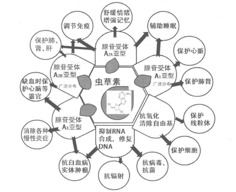 #虫草素(3‘-脱氧腺苷):增加睡眠时间,舒缓情绪,抗病毒,抗菌,明显抑制肿瘤生长,