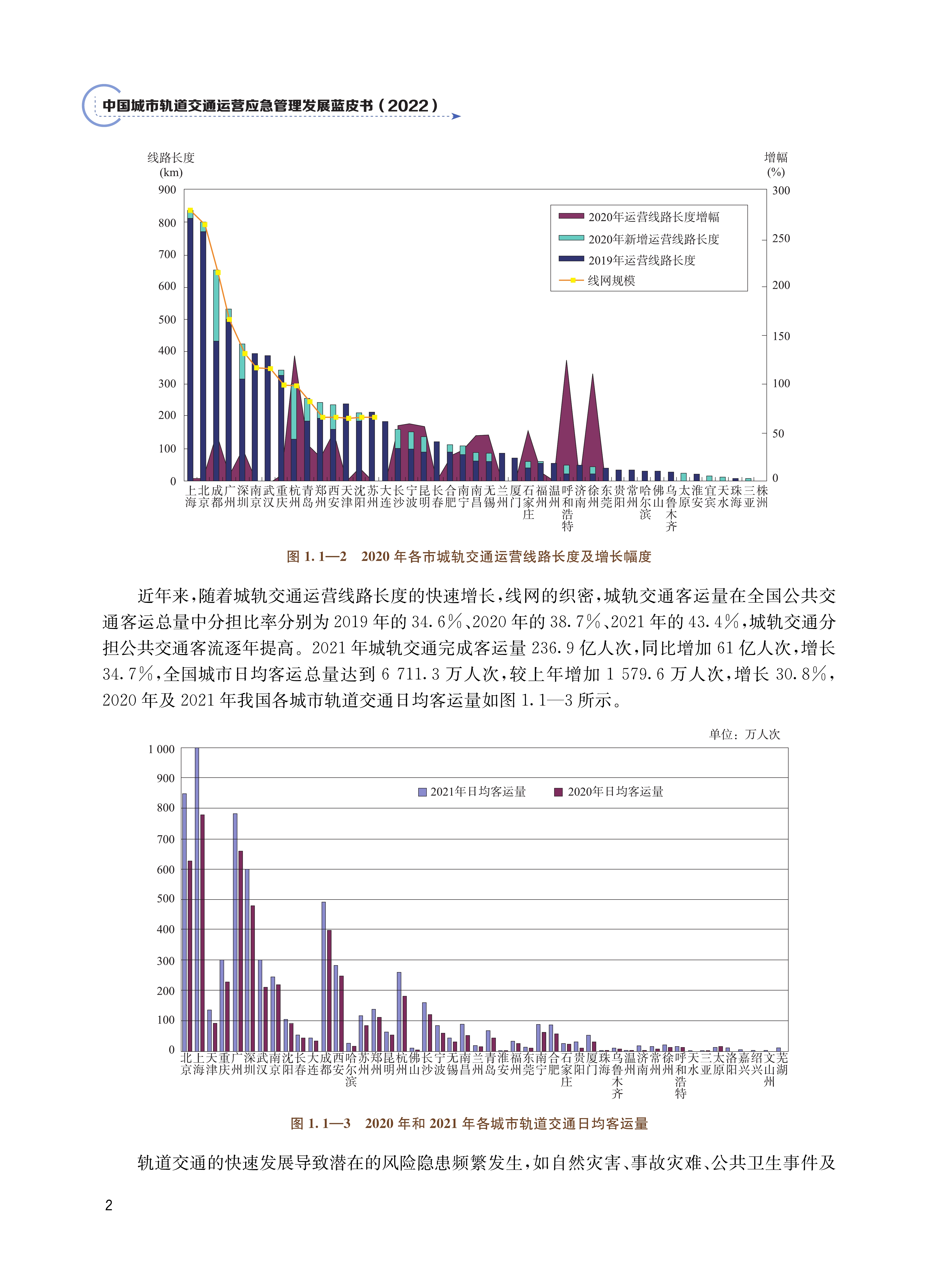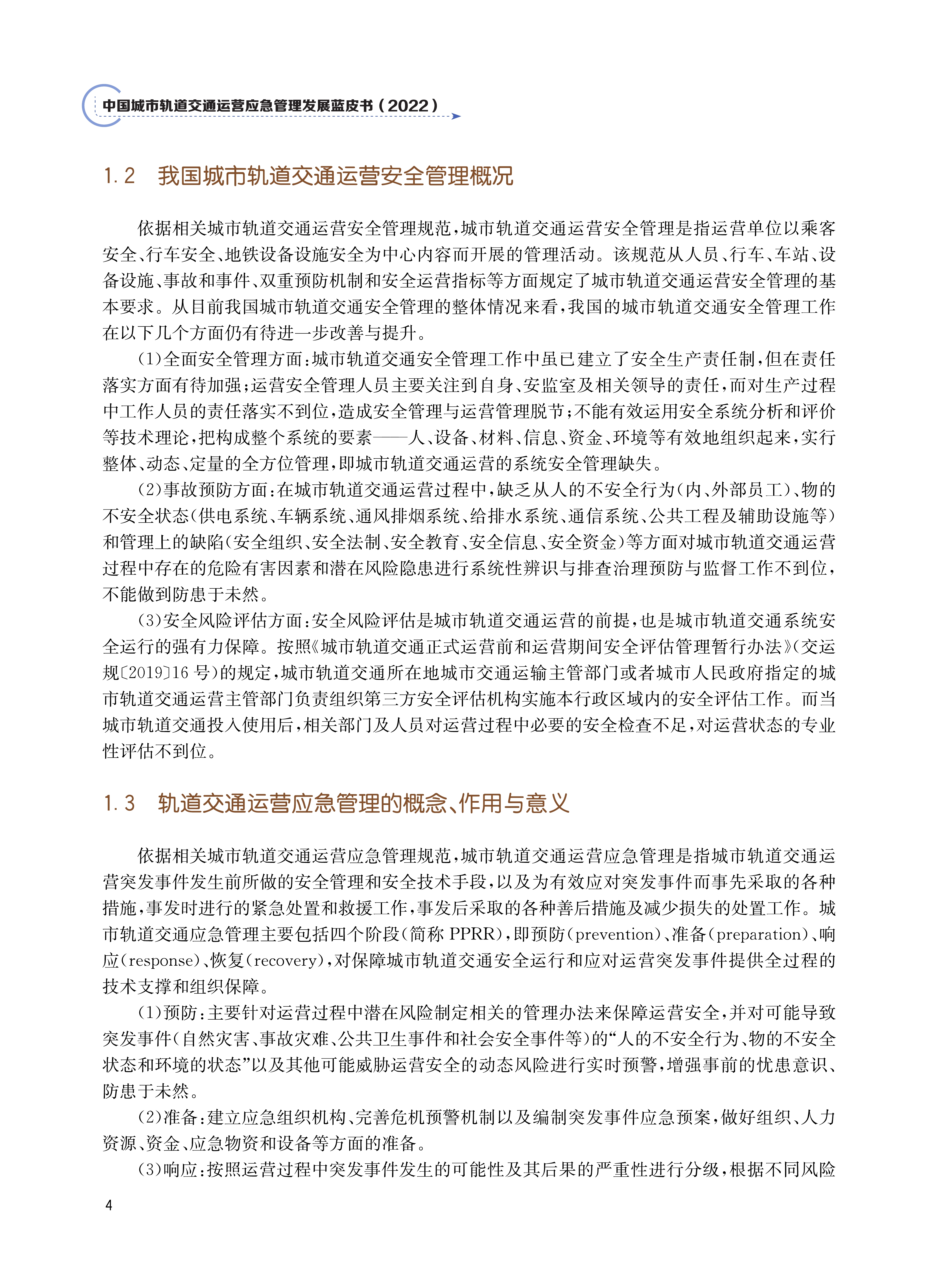 这是我国城市轨道交通运营应急管理领域第一本蓝皮书。蓝皮书的调研编制过程,也是探索和思考如何不断完善我国城市轨道交通运营应急管理体系,提高我国城市轨道交通运营应急管理水平的过程。通过摸清现状、梳理问题、提出对策与措施建议,将为下一步国家有关部门研究制定我国第一部《中国城市轨道交通运营应急管理发展白皮书》,明确我国城市轨道交通运营应急管理未来发展的方针政策、技术路线等,奠定坚实的基础。
