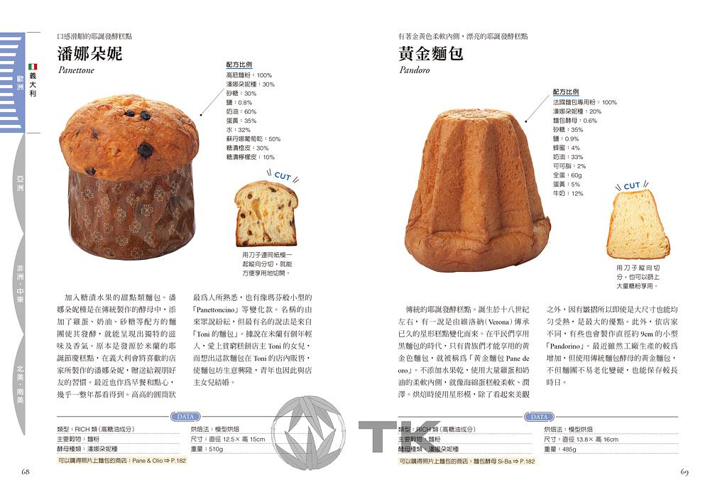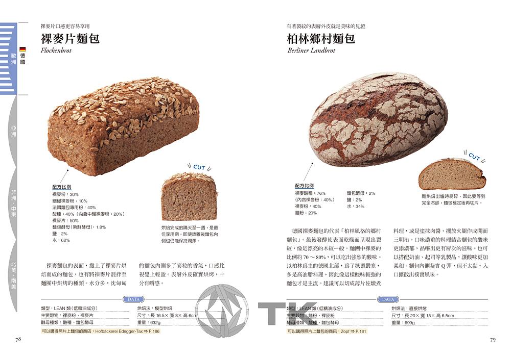這本『世界麵包百科圖鑑』,以歐洲、亞洲、北美南美、非洲中東,等地理位置區分,再細分為各個國家,共收錄123種最常見受歡迎的麵包。每種都詳細地記錄不同店家的製作材料與內容、特色,外觀與剖面照,將比例層次與組織結構紀錄成完整的圖文。還有日本13家*級吐司&日常吐司的完整紀錄分析;中東、伊朗吃什麼樣的麵包?衣索匹亞又是以什麼麵包為主食?