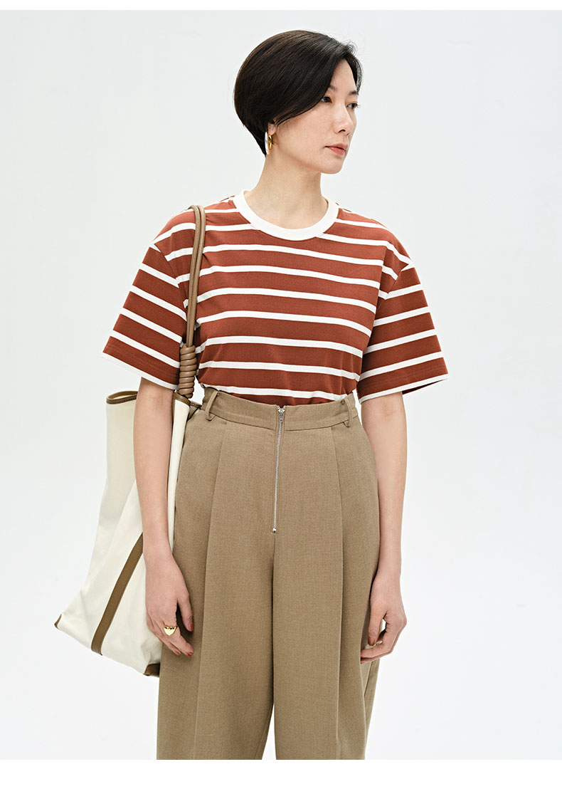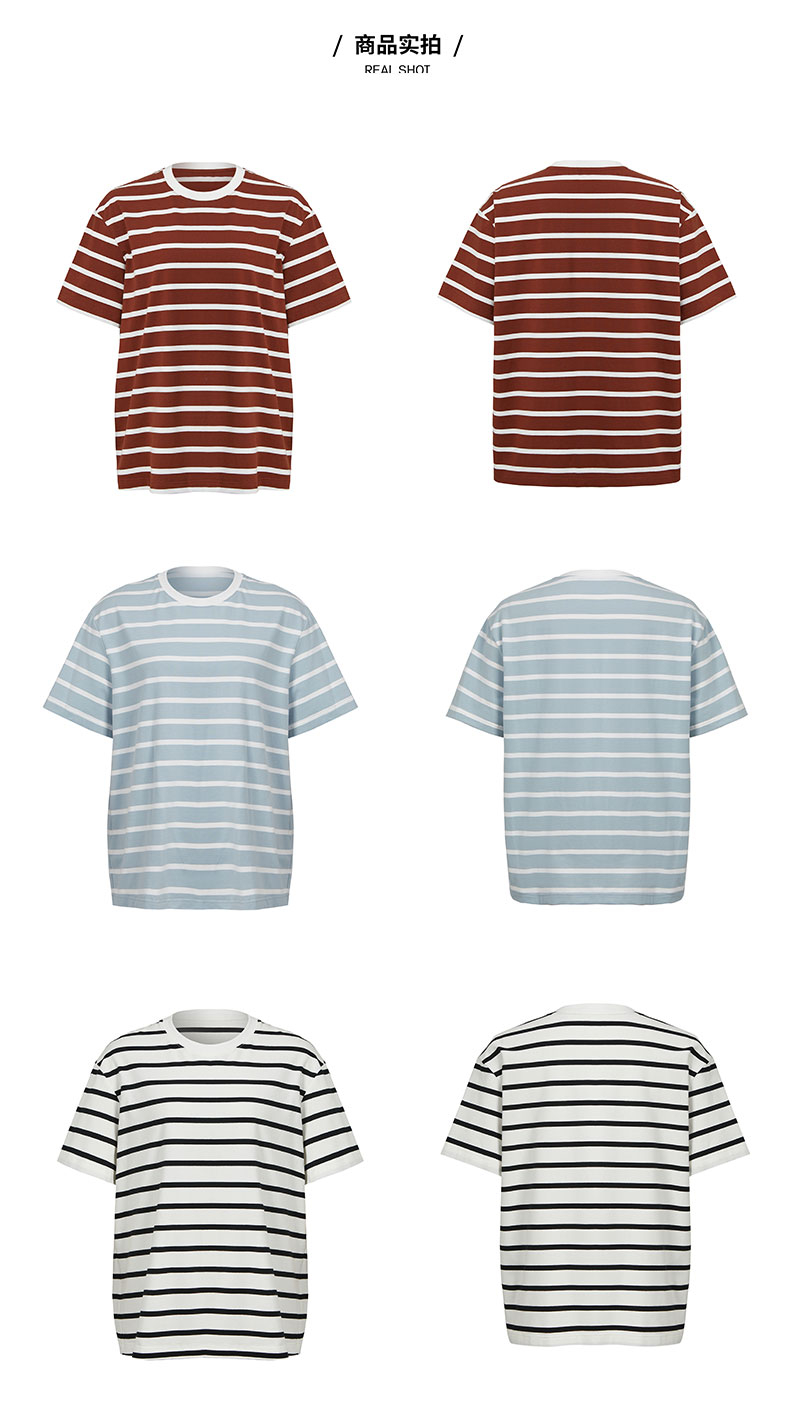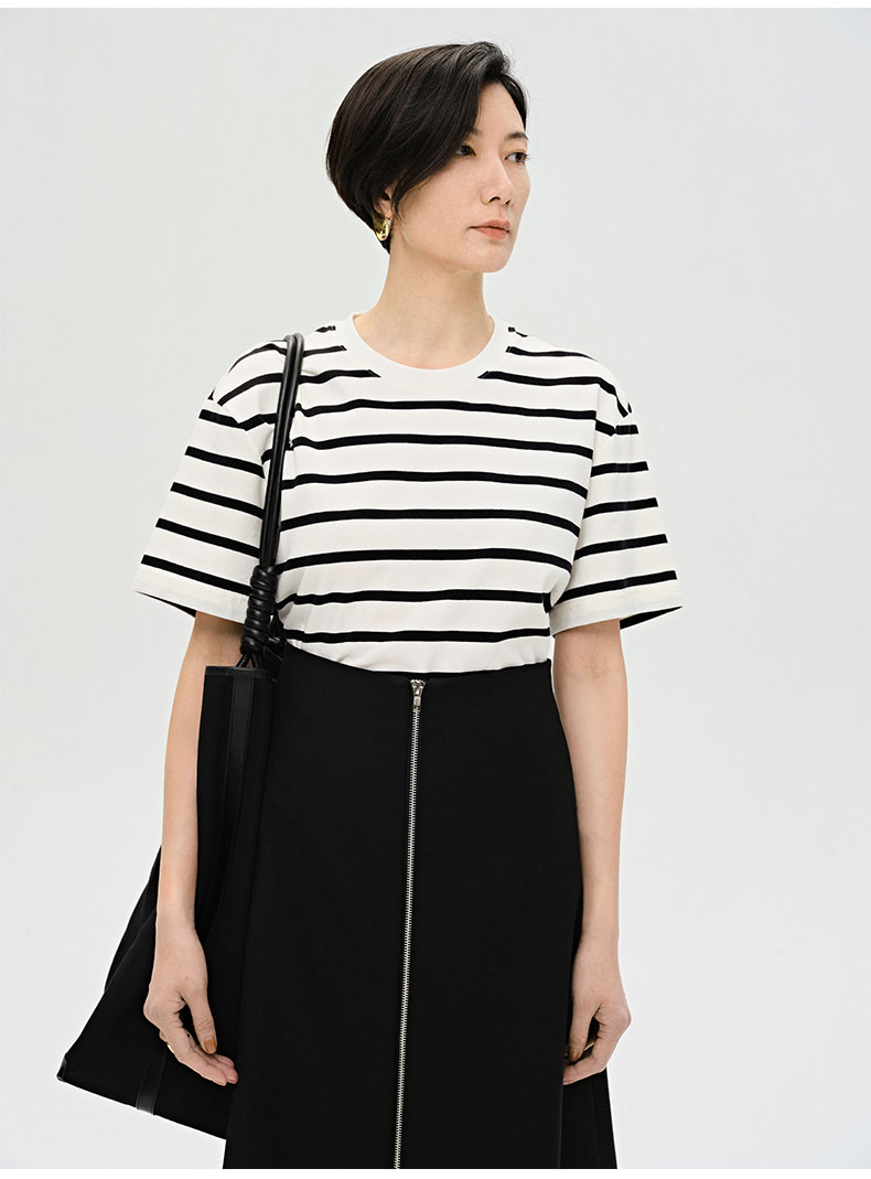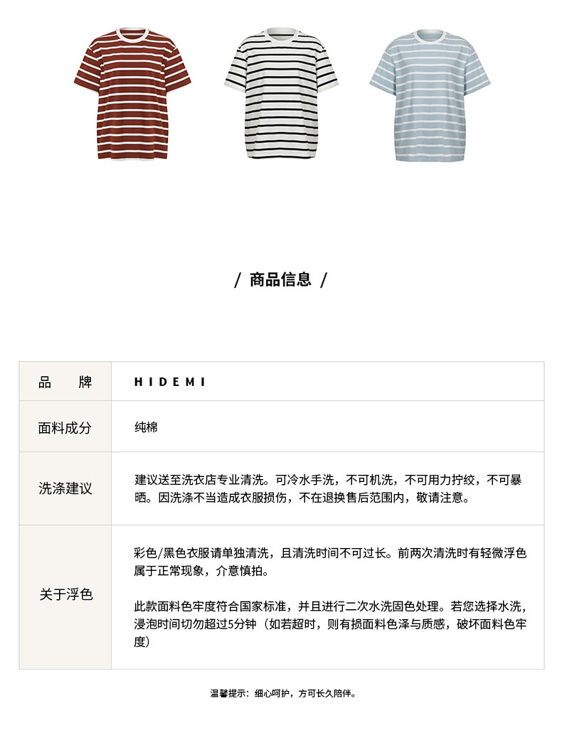 HIDEMI 条纹高密棉圆领亲肤百搭廓形T恤 黑白条纹/蓝白条纹/棕白条纹