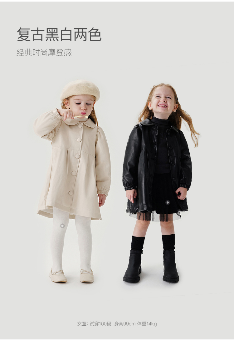 马克珍妮女童甜酷小翻领皮衣儿童中长款外套2024年秋冬新款241023