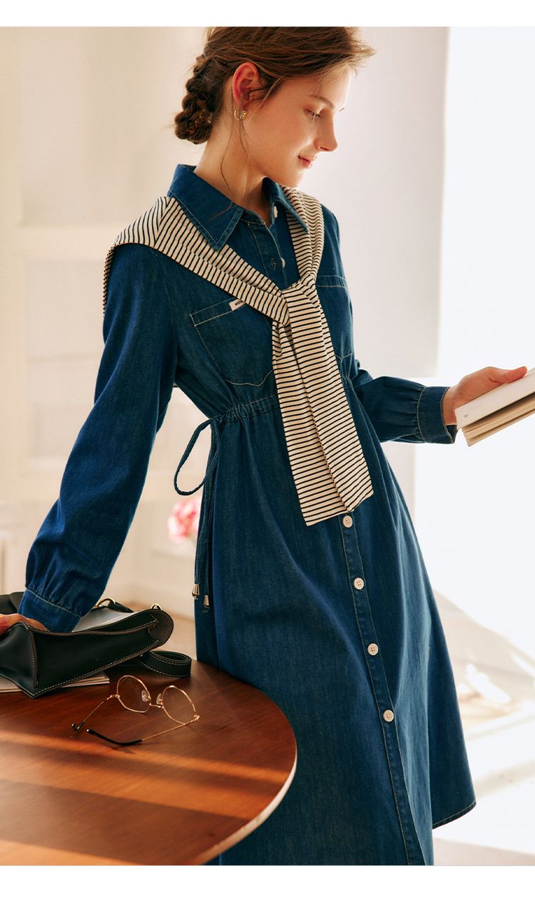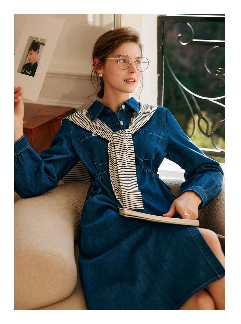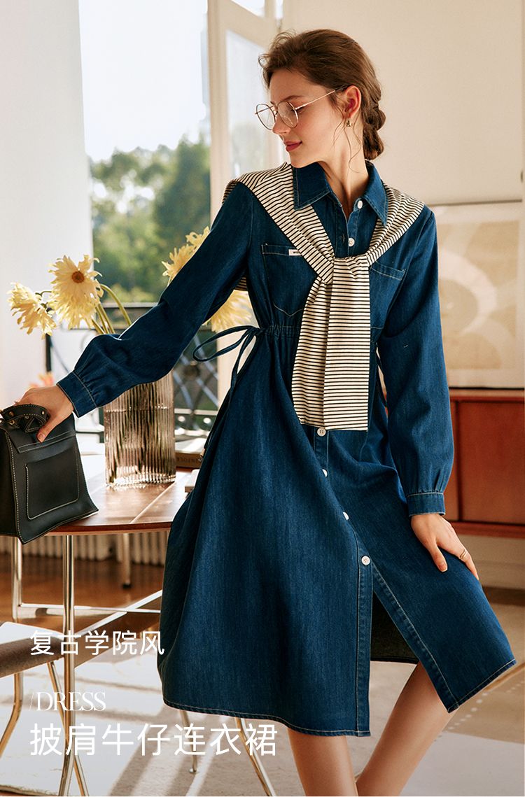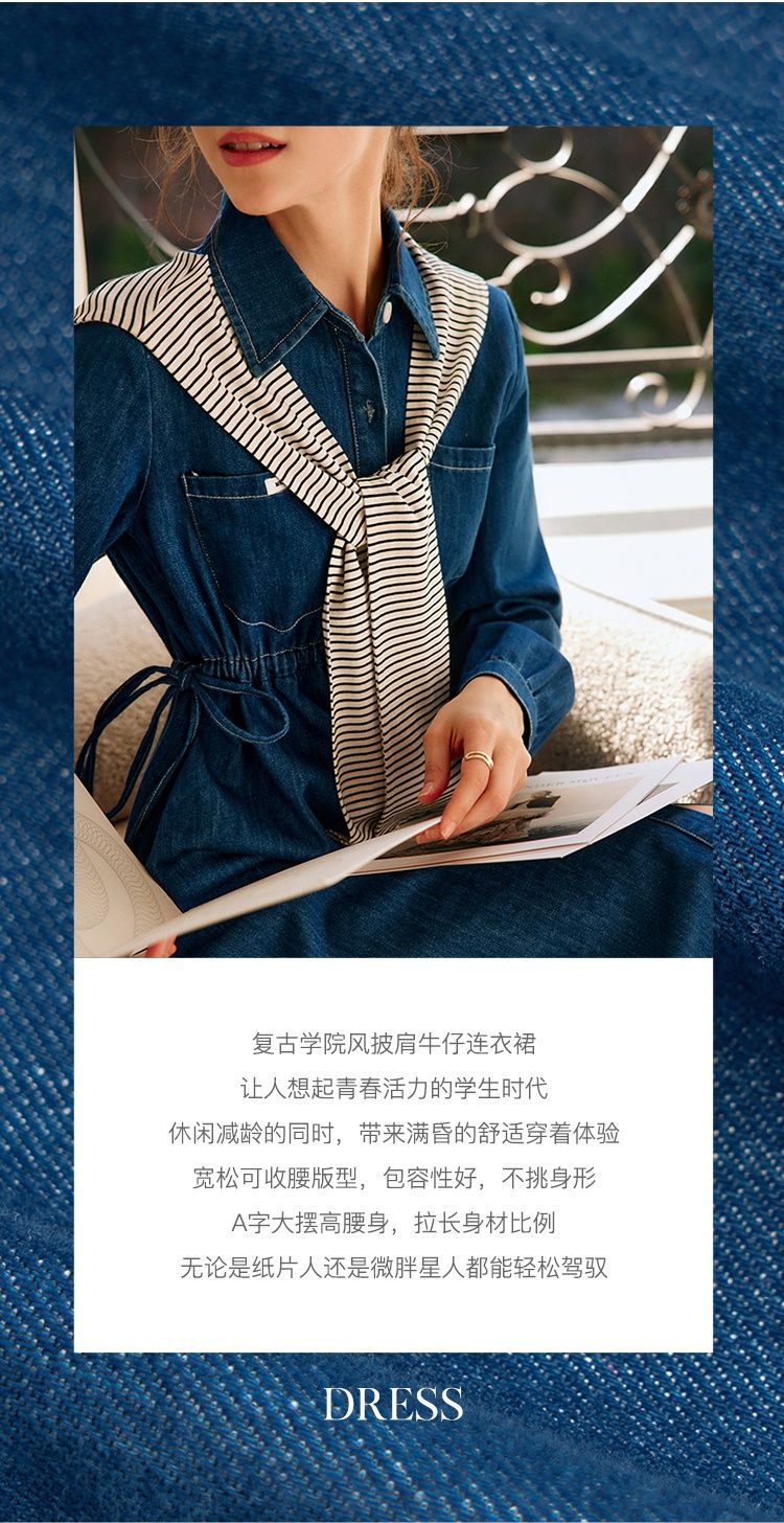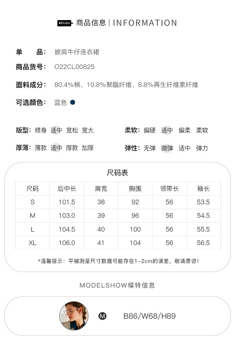 欧芮儿蓝色牛仔连衣裙女春季2022年新款收腰显瘦气质休闲披肩裙子