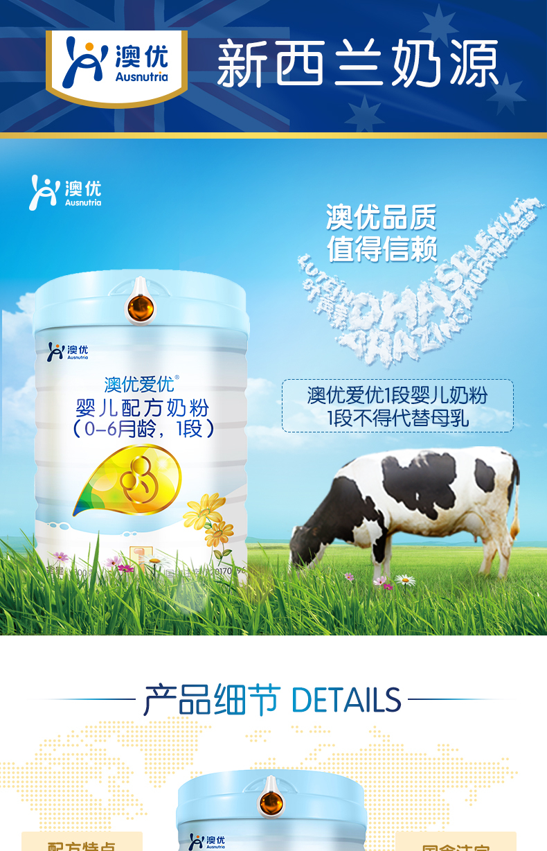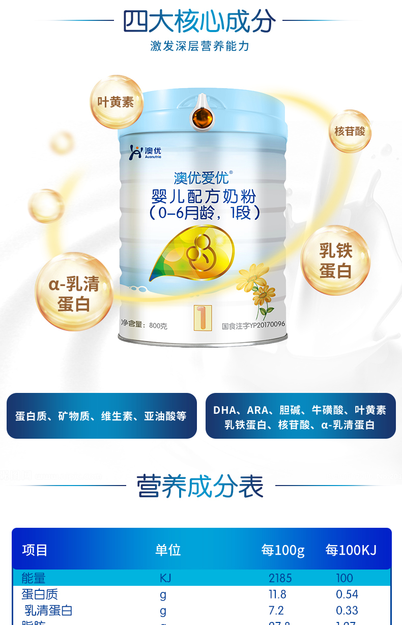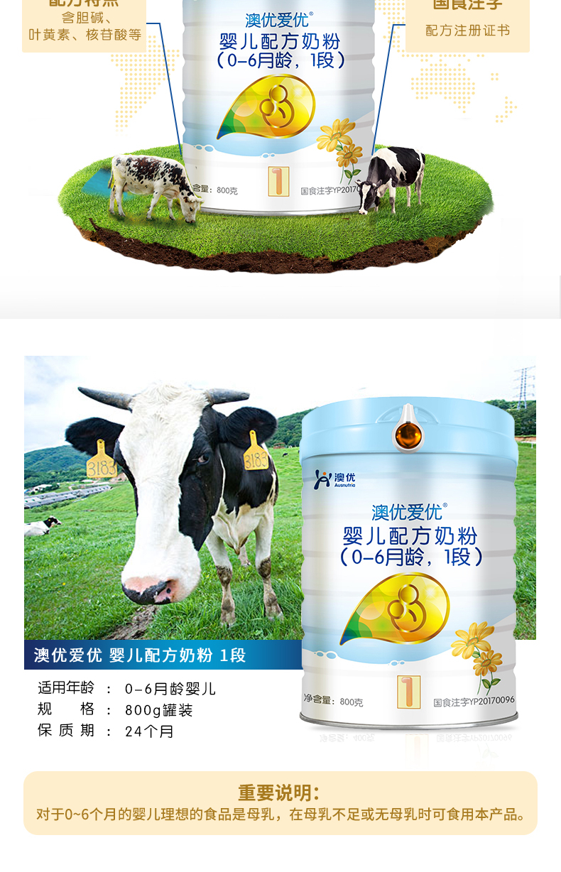 澳优(Ausnutria)金装爱优优选 婴幼儿配方奶粉 1段(0-6个月适用)800g【澳优】