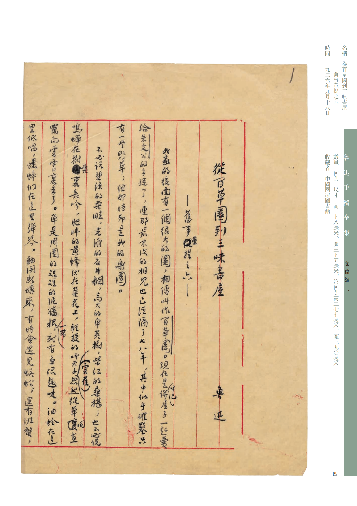 每种手稿首页详细著录名称、时间、数量、尺寸、收藏者、备注等相关信息。原则上据手稿原件原大影印,少数尺寸过大者予以缩印。对稿纸上的残破和污损之处不做处理,以尽可能反映手稿原貌。除《日记编》外,各编均制作索引。索引单独成册,附于全书之末。