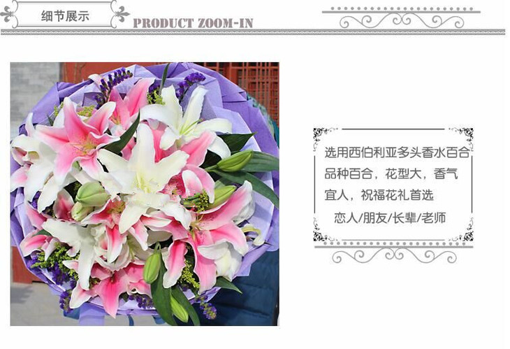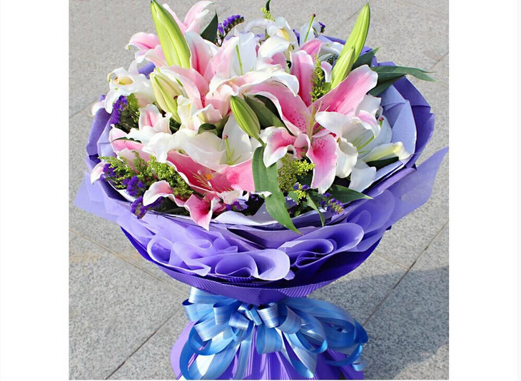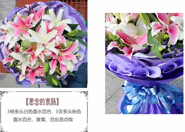思念的衷肠 总计10支多头百合,其中5枝多头白色香水百合,5支多头粉色香水百合,黄莺,勿忘我点缀 内衬淡紫色皱纹纸,外用深紫色皱纹纸围裹,中间夹紫色棉纸,最外层使用紫色瓦楞纸圆形包装,(1233)