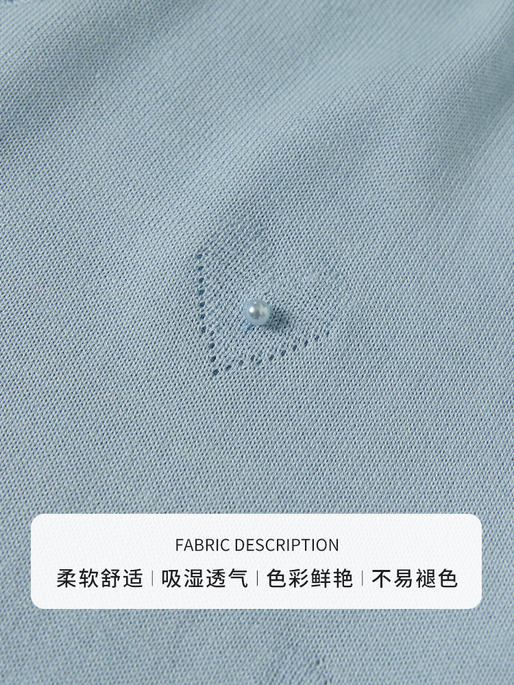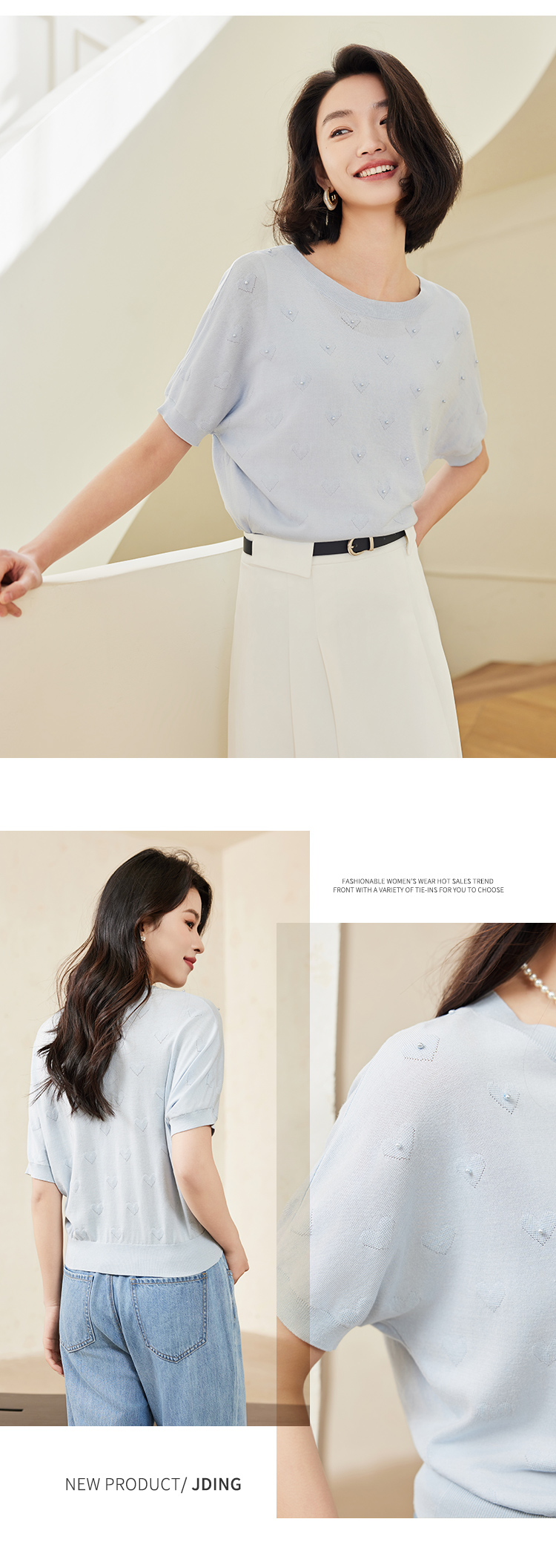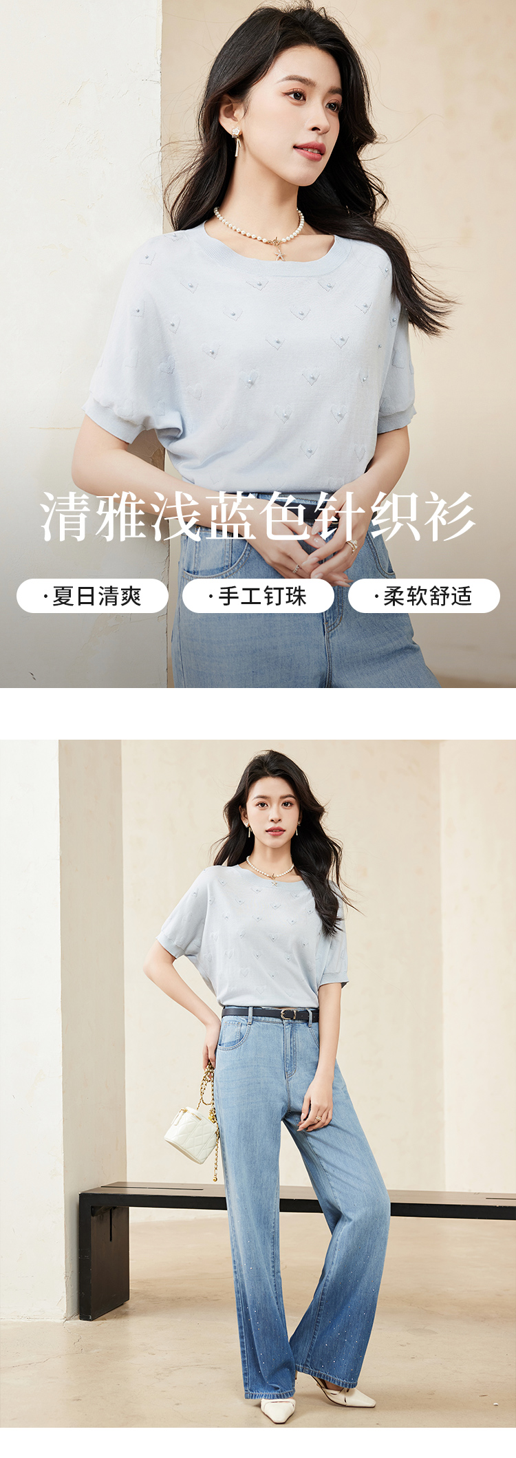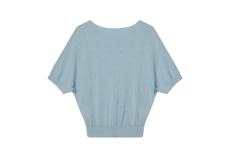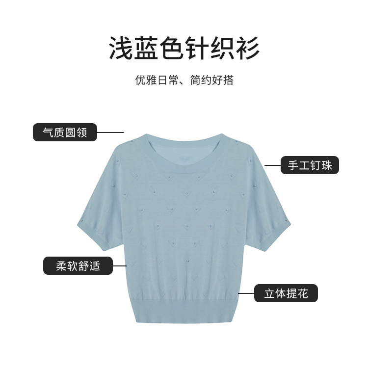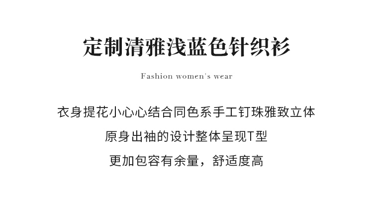 【商场同款】CJKJ410 “ 心随我动套头衫 ” 清新素雅的浅蓝色调 体现宁静气质 T型廓形 蝙蝠袖设计包容身材 立体提花工艺结合手工钉珠设计 肌理感丰富又美观