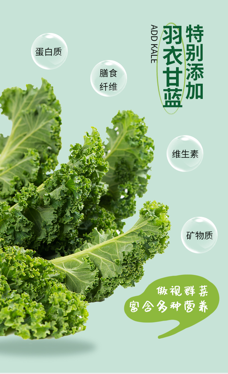 4、特别添加“超级蔬菜”羽衣甘蓝:低热量高纤维,富含维生素 C、维生素 K、钙等多种营养精华