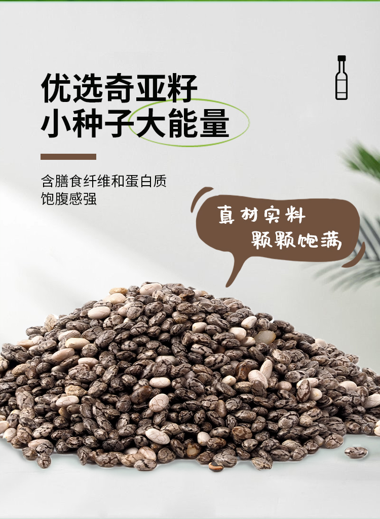 3、优选奇亚籽:真材实料颗颗饱满,饱腹感强,膳食纤维丰富,蛋白质含量高