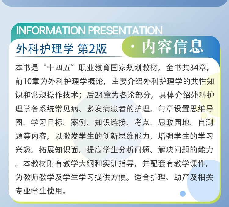 本书是“十四五”职业教育国家规划教材,全书共34章,前10章为外科护理学概论,主要介绍外科护理学的共性知识和常规操作技术;后24章为各论部分,具体介绍外科护理学各系统常见病、多发病患者的护理。每章设置思维导图、学习目标、案例、知识链接、考点、思政园地、自测题等内容,以激发学生的创新思维能力,增强学生的学习兴趣,拓展知识面,提高学生分析问题、解决问题的能力。本教材附有教学大纲和实训指导,并配套有教学课件,为教师教学及学生学习提供方便。适合护理、助产及相关专业学生使用。