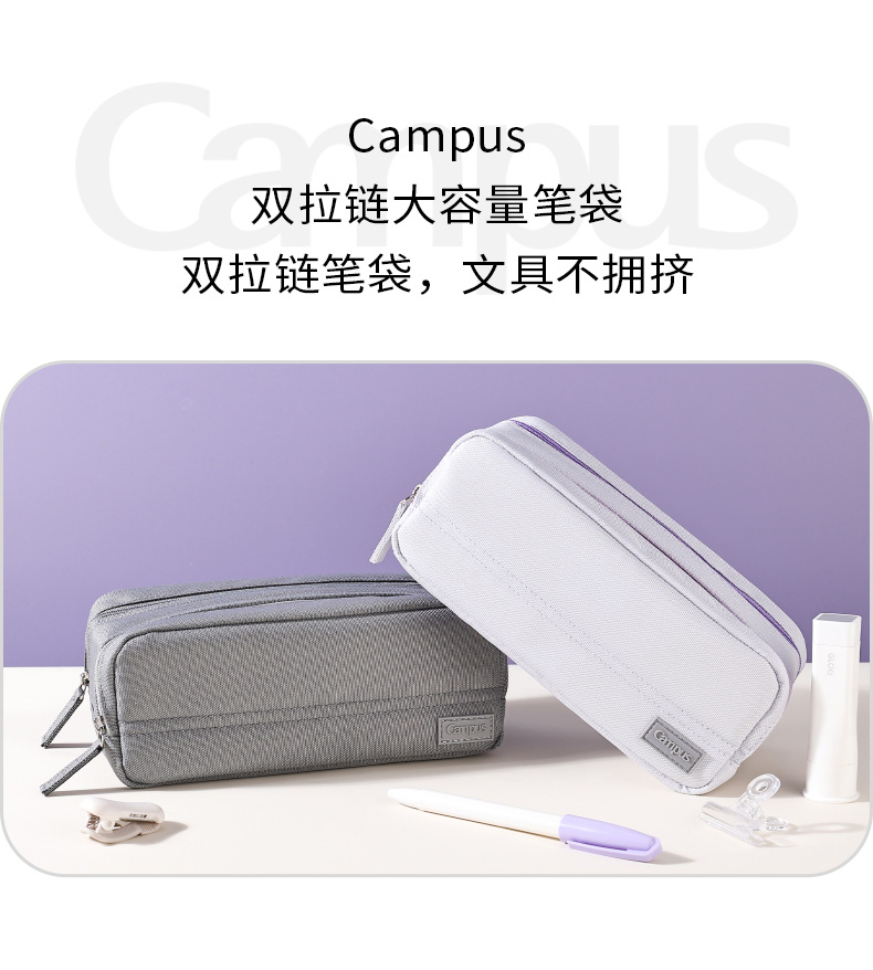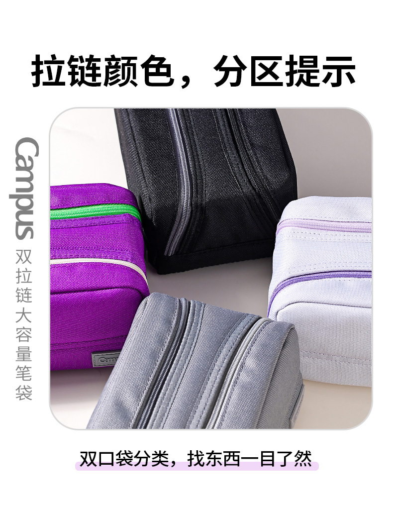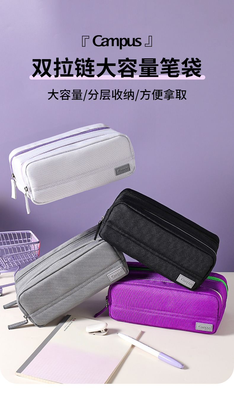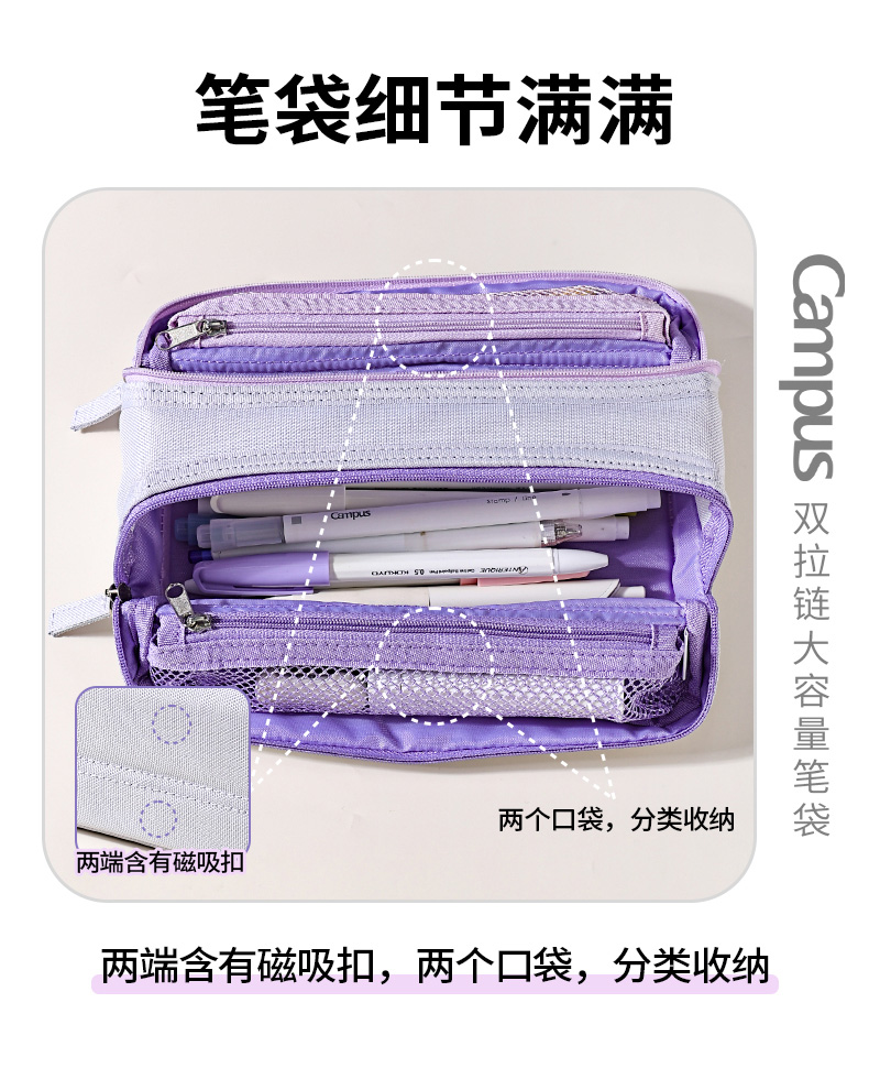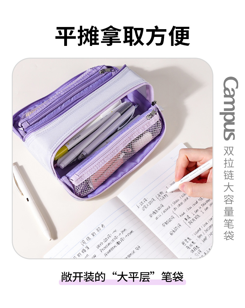 国誉Campus双拉链笔袋多功能分类收纳磁吸设计可平摊收纳包