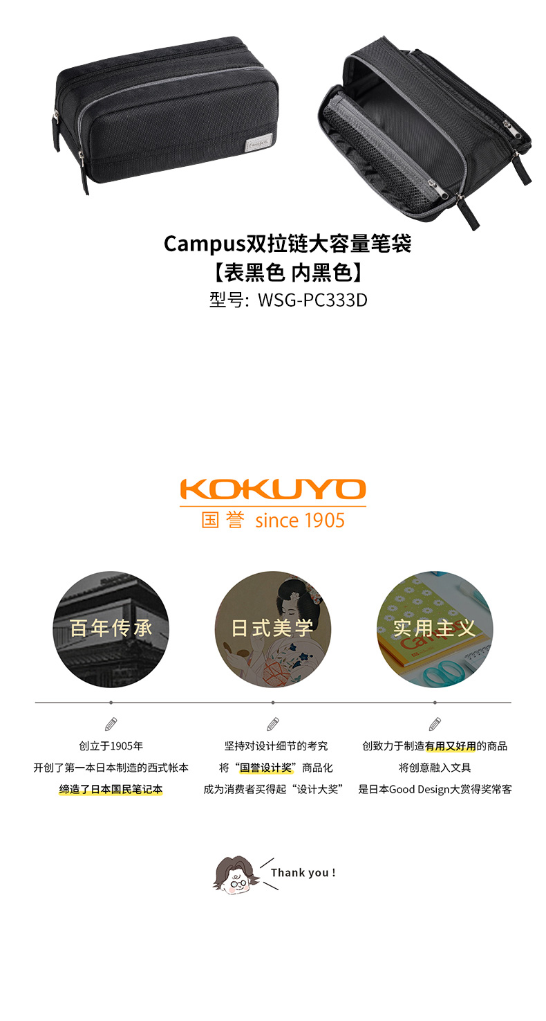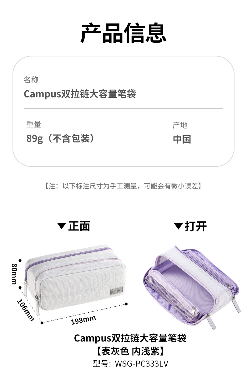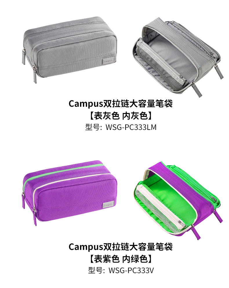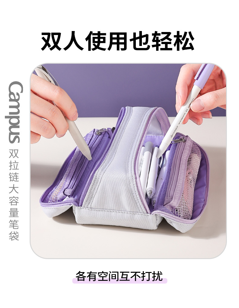 国誉Campus双拉链笔袋多功能分类收纳磁吸设计可平摊收纳包