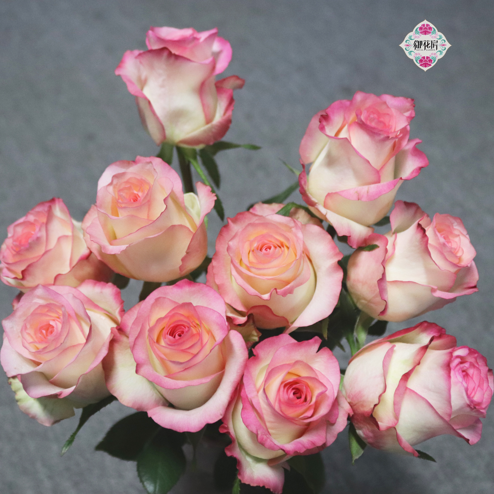 艾莎:源自厄瓜多尔的枪炮品种。 杯状花型,开放度适中。仅边缘部分着粉色,花期较长。它饱满的花头,鲜艳的颜色,粗直的花杆让爱花之人爱不释手,被誉为玫瑰中的“劳斯莱斯”之一。