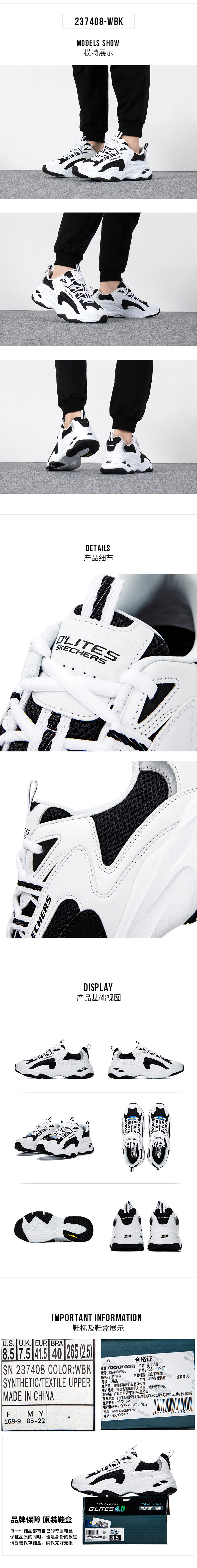 Skechers斯凯奇男鞋 2022新款四季款熊猫鞋轻便减震休闲鞋男厚底增高老爹鞋透气低帮绑带运动鞋 237408-WBK