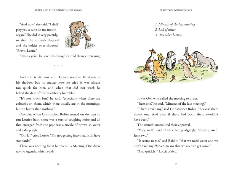 故事配以马克·伯吉斯以E.H.谢泼德风格绘制的精美插图。马克·伯吉斯此前曾为《从前有只熊》和《世界上很好的熊》绘制插图,因此他非常适合这种风格。