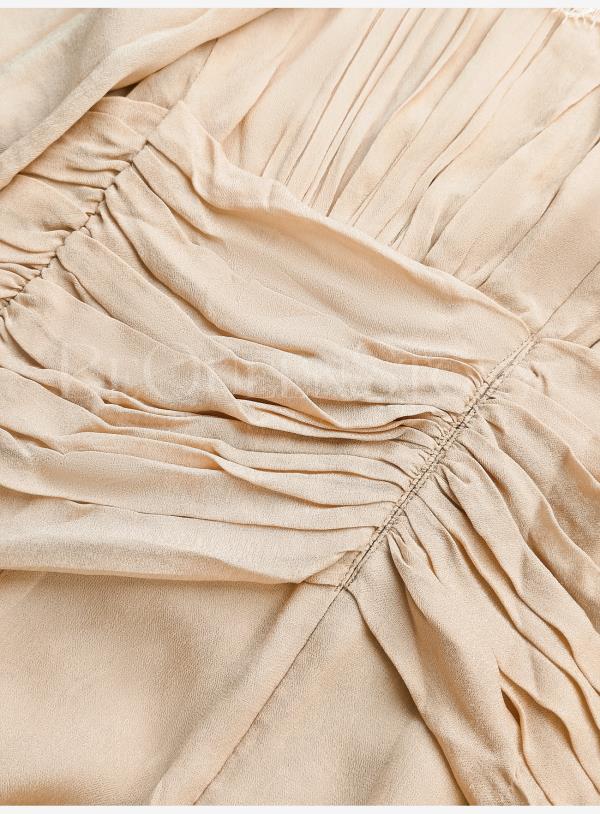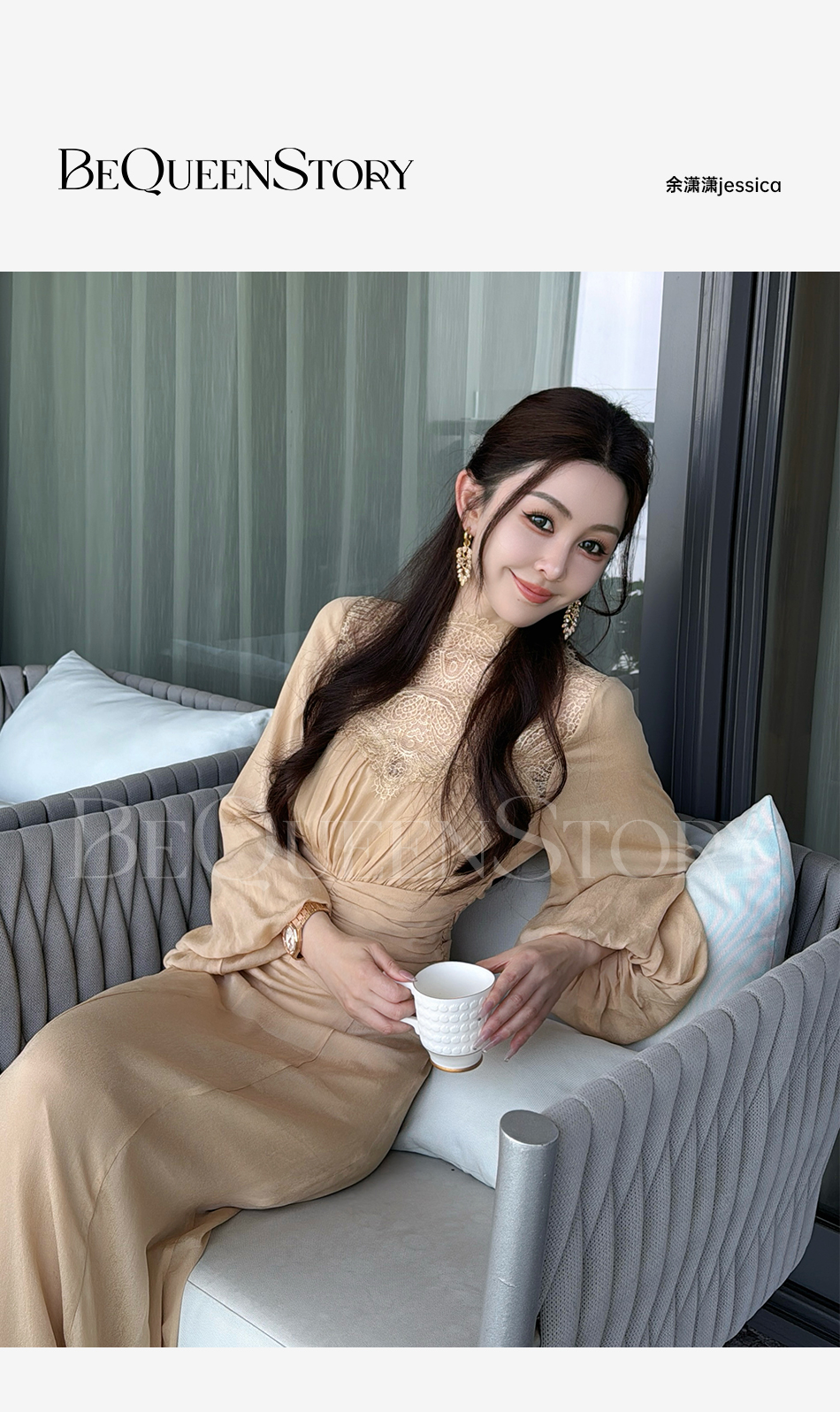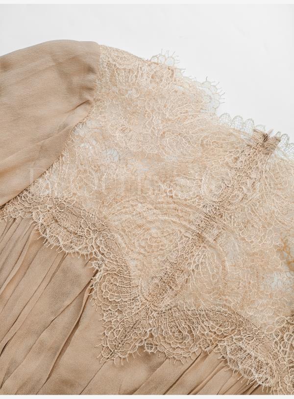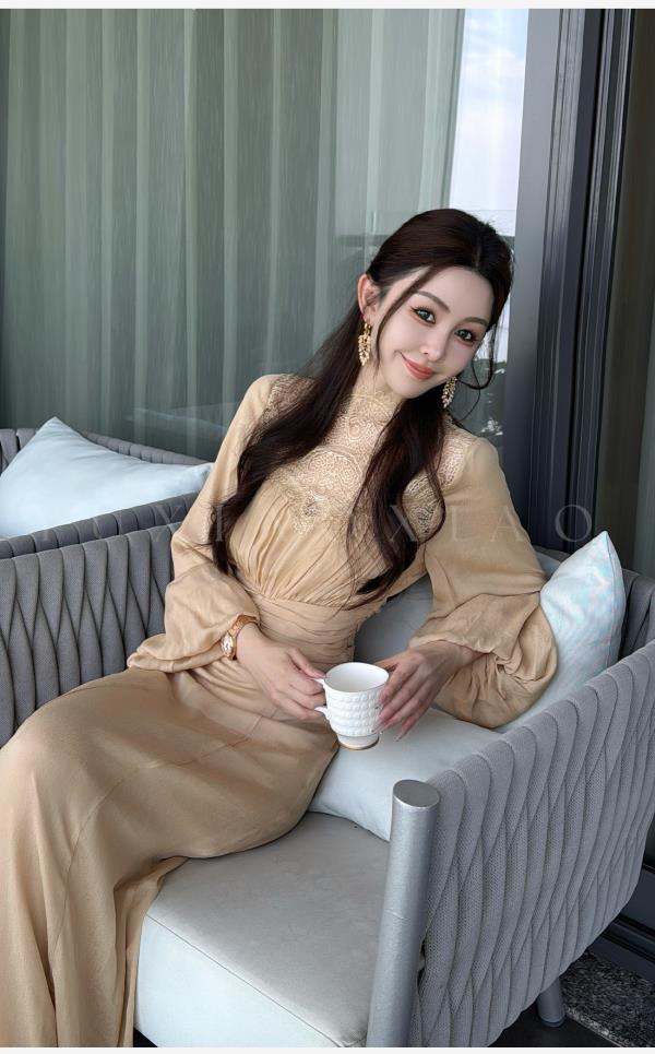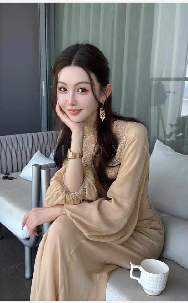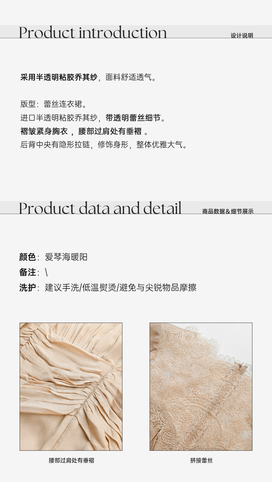 余潇潇【爱琴海暖阳】乔其纱气质优雅褶皱收腰修身拼接蕾丝连衣裙