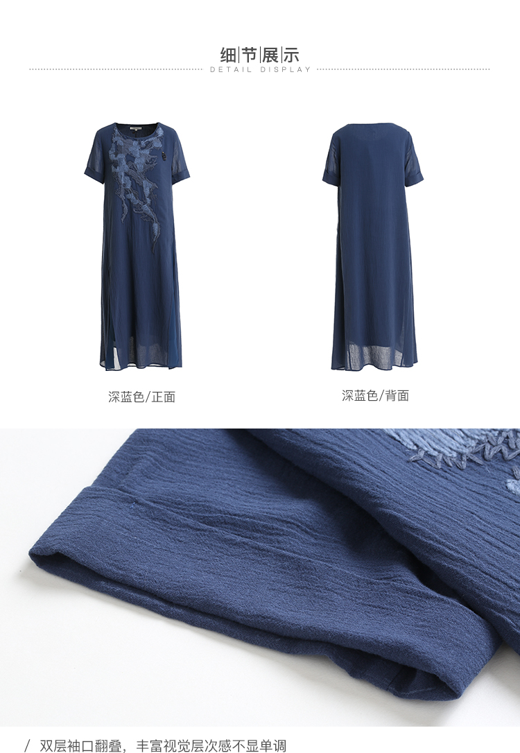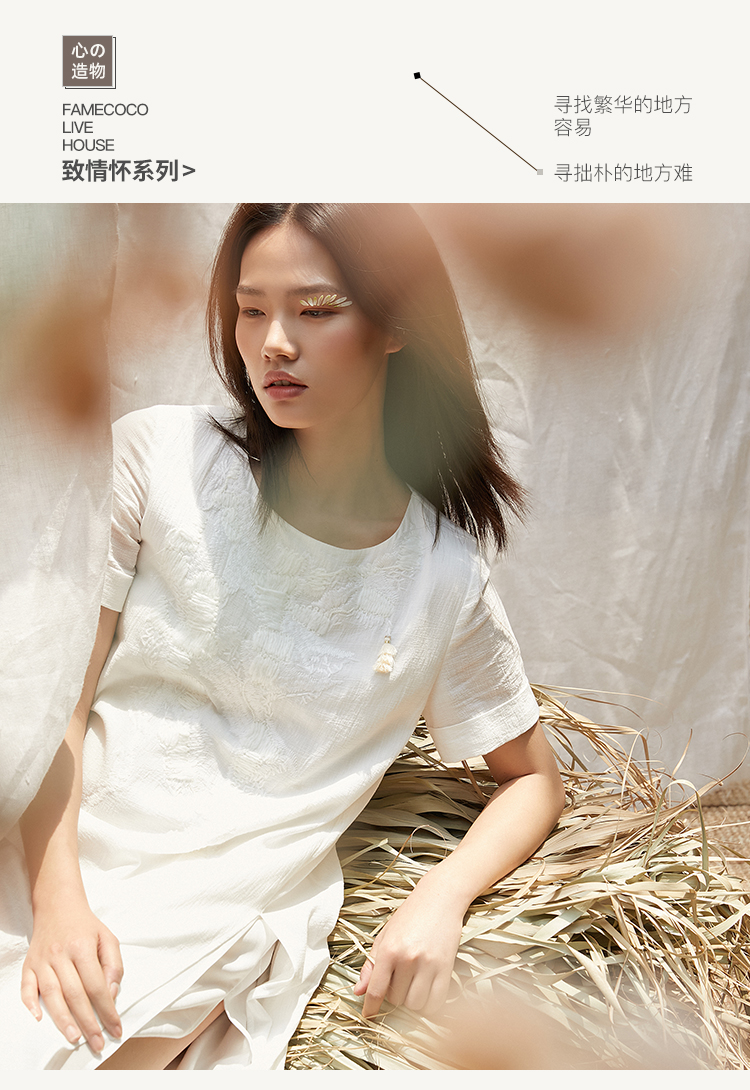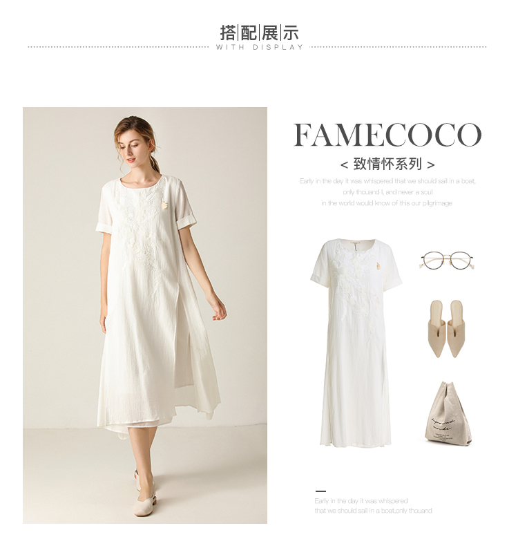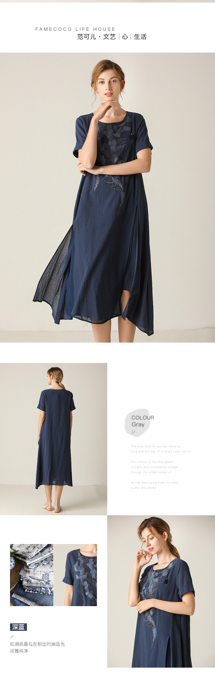 Famecoco范可儿连衣裙绣花圆领丝麻混纺连衣裙长裙F203FA050