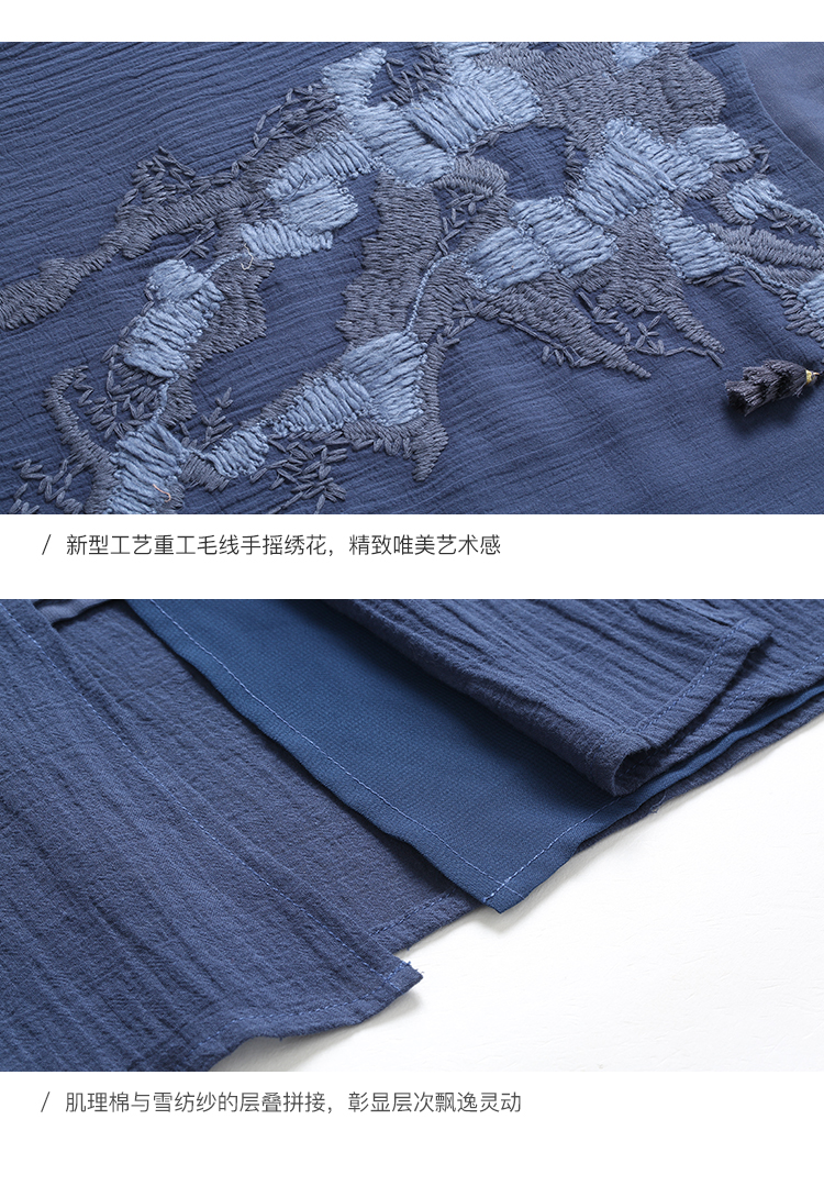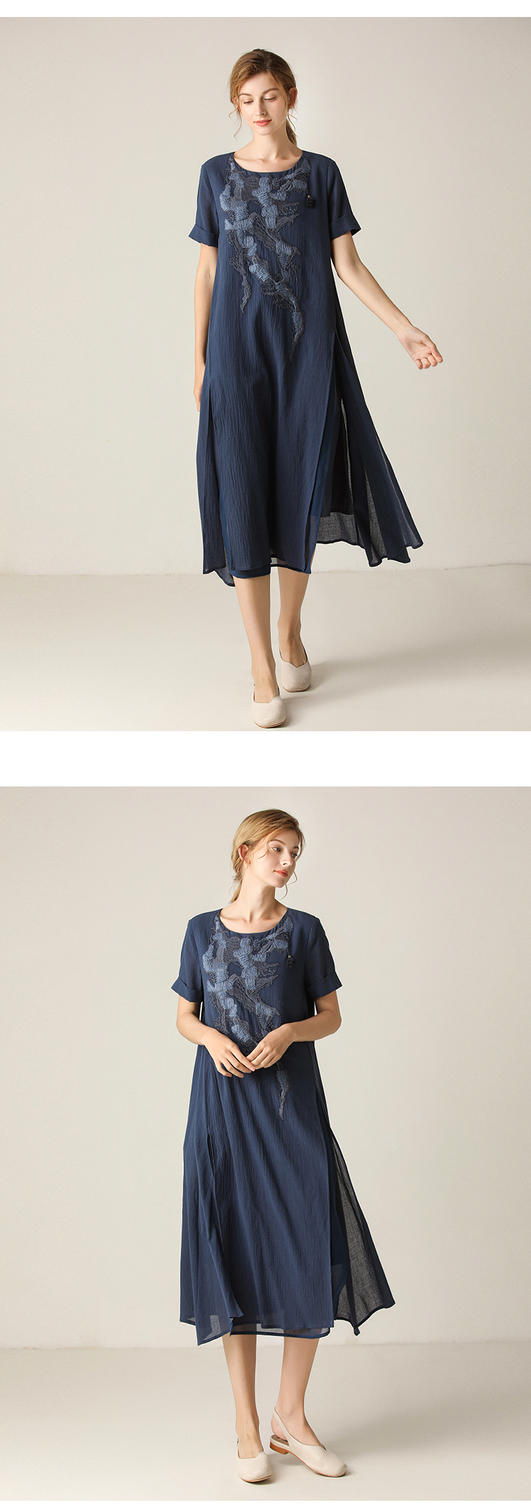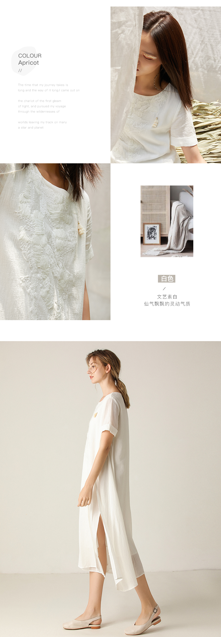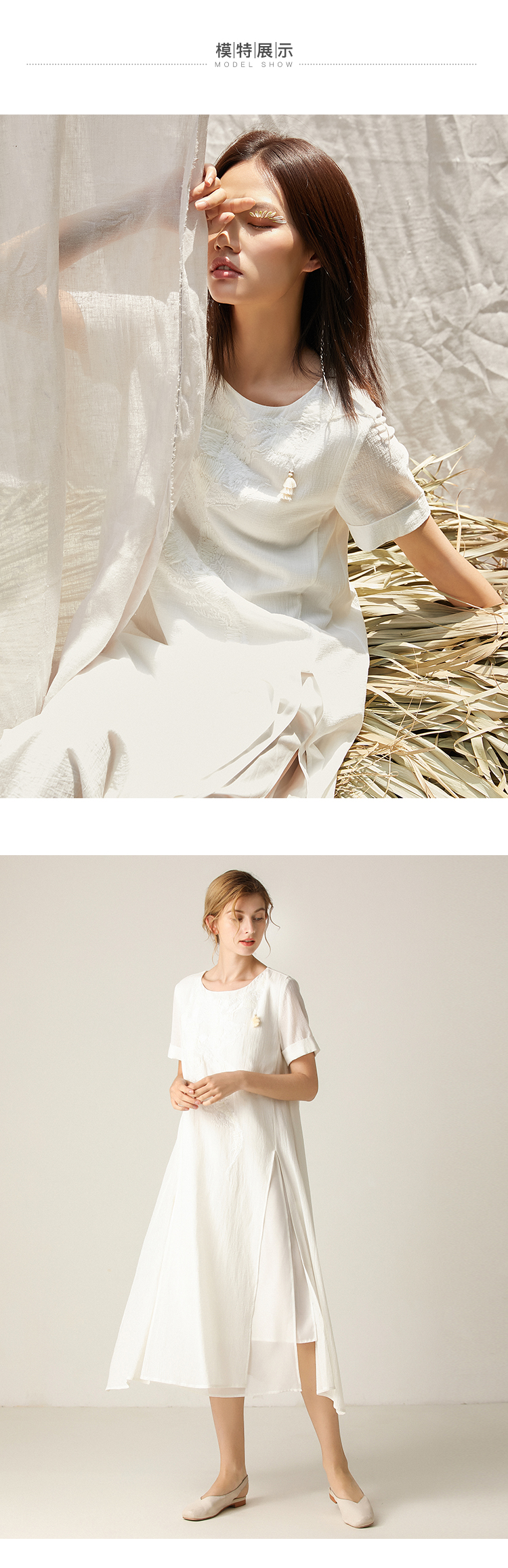 Famecoco范可儿连衣裙绣花圆领丝麻混纺连衣裙长裙F203FA050