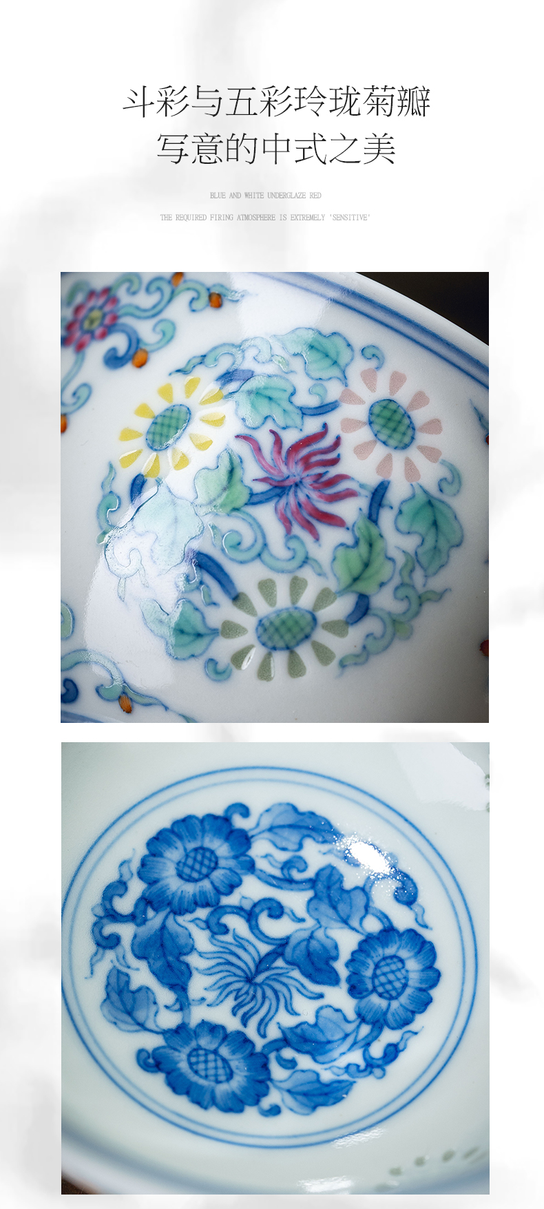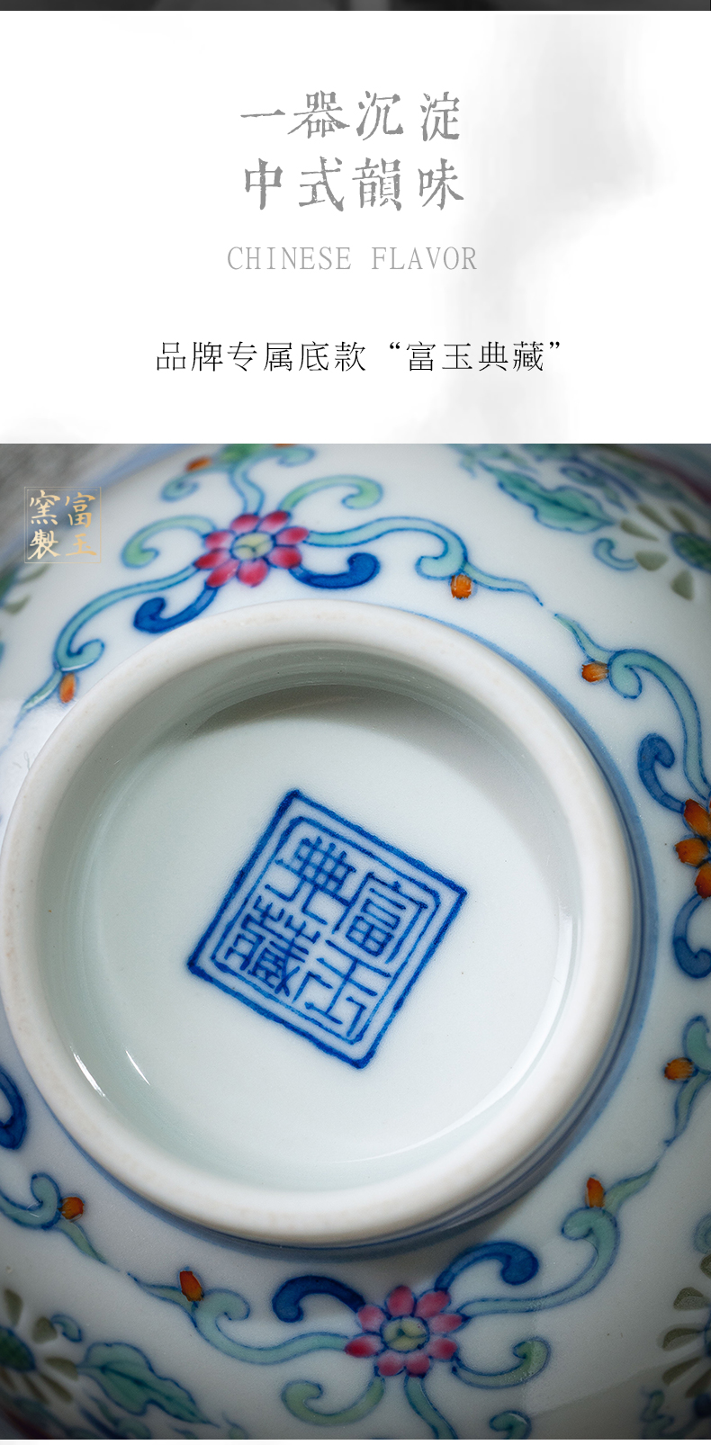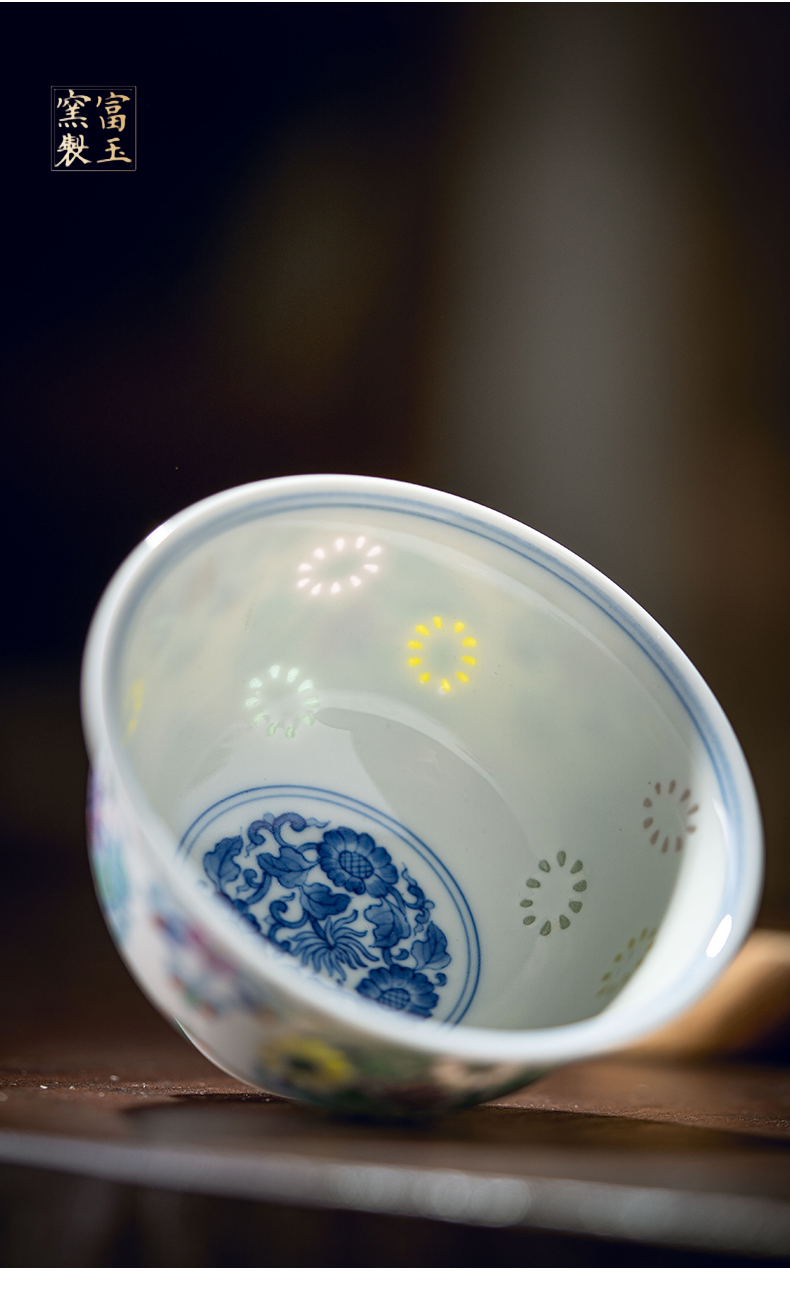 富玉窑 景德镇手工青花斗彩团菊玲珑主人杯盖碗茶具套组