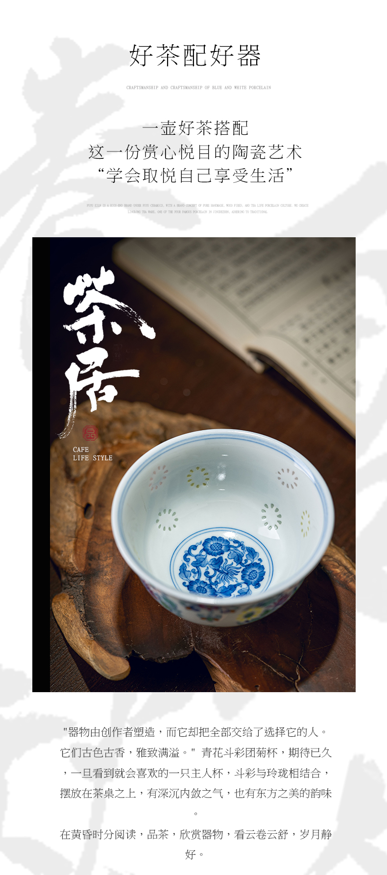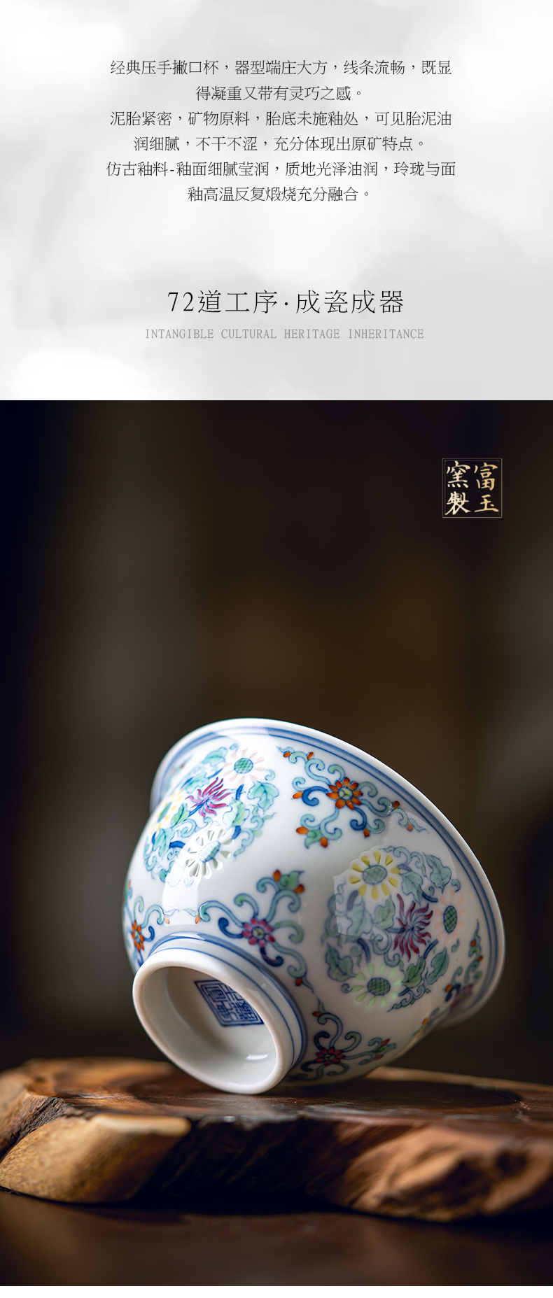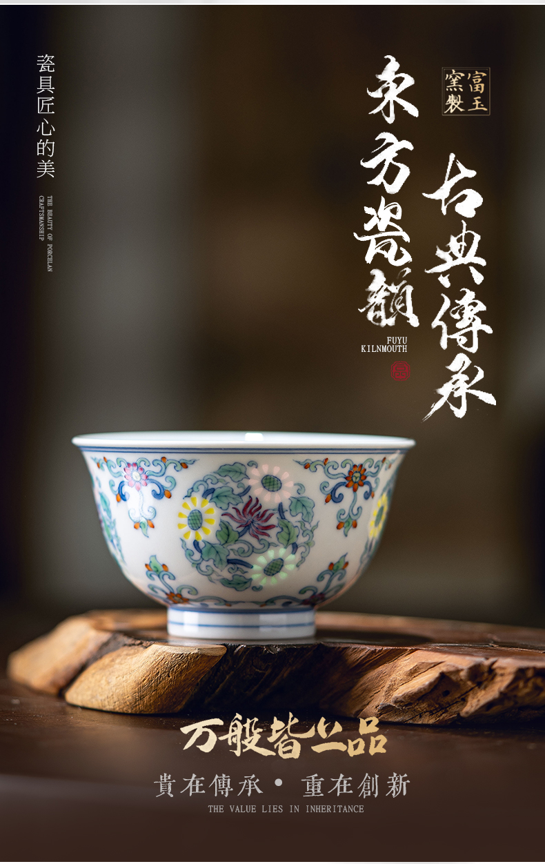 富玉窑 景德镇手工青花斗彩团菊玲珑主人杯盖碗茶具套组